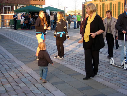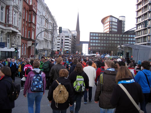 Anja kümmt, un wi seilt so ganz sinnig in Richtung Hafencity. Mit uns tosommen geföhlte dusend anner Minschen. Mi kümmt de Parkplatz wedder in Sinn. Veele Bauden, Stände, Dische, Bänke för den "Obend, sik to bemööten". Anja kennt sik ut. Wieder in Richt op de groode Bühn to. Mit uns noch mehr Minschen,