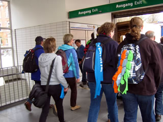 1. Dag: Middeweeken Nomiddag Klock 2: Wi föhrt tohuus los. S-Bohn Parkplatz Nettelnburg. Oh kiek, wo kümmt de denn her? De Autonummer kenn ik hier gor nich De ook nich Un de??????? Och kiek, de het ook en Fisch-Opbacker an sien Auto. Oh, dat is en Posaunist Woso parkt de denn alle hier, givt doch so veele Parkplätze rings üm Hamborg????? Rupp op den Bohnhof. Kiek, de Mann dor, de het all en Karkendagsschal. Un dor, de ganze Familie. De S-Bohn kümmt. Noch mehr Lüüd mit Rucksäcke un blaue Schals. Hauptbohnhof rut. Minschen mit Rucksäcke, Kuffer, blaue Schals,