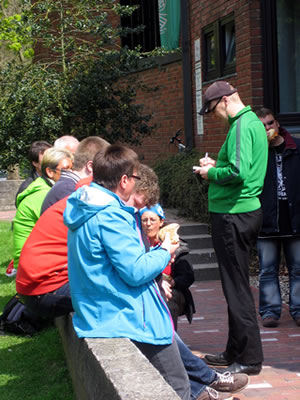 geit dat ook schon wedder rut ut de Kark. Vördrach över en Kunstistallation. Nee, wi mööden nu ers no'n Supermarkt, Obendbrod inkööpen. Picknick op de Wisch vör dat Gemeendehuus. Obendgebbed op Platt. 5. Vadderunser.
