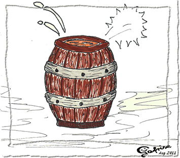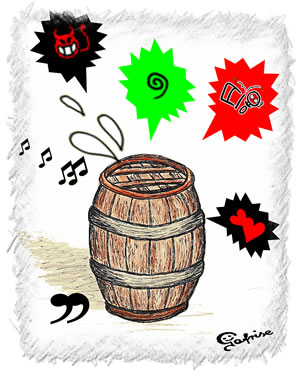 Üm dat he denn nich so heel un dall ut d Stüür leep, kreech he jedermoal de ole Heringstünn över sien Klauterboom. Dat hull hüm oaber liekers joa nich van d Schnakken ov un wenn de Visit denn so üm sükk tokeek, wor dat schenierlich Schnöätern woll manken keem, denn sää Opa Rass jümmer ganz plietsch un unschüllich: "Oach, dat is blods mien oled Schnakkfatt." |
