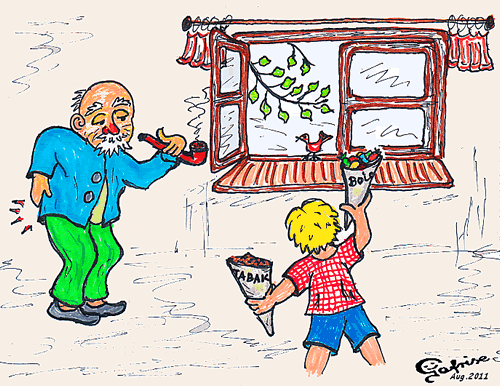 Oostfreeschkes Platt "Kobus!" Opa Rass har dat ropen. He seet an sien oapen Koamerfenster in de ole Sörch un leet de Haarstwaarmte in d Huus. De ole Koptein kunn vandoach moal wäär nich so recht lopen. Dat Rheumoa mook sükk jümmer mehr in siene Knoaken breet. Kobus wee in d Tuun mit sien lüütji Hund an jachtern. Eelich heet he Jacobus noa sien Unkel, de vöörtieds in d Kreech blääven wee. De Lüü sään oaber blossich aal Kobus to hüm. "Kobus!", muss Opa Rass noch moal ropen in sien Hüdelee mit dat Hundje har Kobus dat eerst moal ropen gannich hört. Nu keek he up un keem furss ansuust. Wenn Opa Rass reep, denn geev dat meist wat to schlikkern. Irgendwat Söötes föör en Kinnerhart leech jümmers in de schwielige Hannen van Opa Rass. "Kanns ähm vöör mi noa Jüülfs lopen?" half wee dat een Froach un half ok woll nich. "Ikk hevv keen Tabakk mehr in d Döös." Jüülfs, dat wee de Koopmannsloaden in Willmsfeld an d Dornumer Schossee good dusend Trää de Sandpadd andoahl. Un ov he dat kunn! Alleen all wägen de Boischies, de Tant Jüülfs hüm jümmers in sien Büksentaaschke stook. "Ikk moot ähm furs Mama Bescheed särgen, ikk bün glieks wäär dor." Wiel, dat muß he doon, dat see wuß, woar hör lütten Jung ovblääven wee. Un denn biers he los. Noa een Vierdelstünnen wee he wäär retour mit een grooden Spitztut Bünting-blau in een Fuust un in de anner een lütten Spitztut mit Goldnöäten. Vandoach wee joa Soaterdach un Soaterdachs geev dat jümmers wat extroas. He kunn mit sien lüütji Aarms noch nich in dat Koamerfenster rinlangen. "Koam man ähm rin", sää Opa Rass, "de Döör is blossich in d Klepp." In de Koamer hung so een lichten Schmoak van dat Törffüür in d Lücht Opa Rass har all inbööt. "Wenn man wat öller is, hett man nich mehr so vööl Hitt in d Liev", sää he jümmers, wenneer de een ov anner dat moal to waarm bi hum dücht. Up de eeken Buddelee in d Hörn stunn een olet Heringsfatt oahn Böän, glieks dor tägen seet up sien Klauterboom Smutje. Smutje, dat wee een heel griesen Papagei he wee woll hoast so old as Opa Rass un fiegelinsch wee he as son ollen Jan Maat. Wenn Opa Rass ut Laangwiel mit hüm schnakken wull, drei he de Kopp wäch un keek sien ole Koptein mit de Mors nich an.