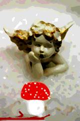 As dat Avend wöör, dor wee een lies Wimmern to hören. Wo keem dat her? De Dwarch un de Fleig lusterten un lusterten. Denn verstünnen se. De beiden lütten Poggenstäuhl ünner den groten "Fleigenpilz" klagten dat de daalkamen Engel. "Kiek di maal an, wat se mit den groten Pilz maakt hebbt. Un wi? Wi hebbt en rodes Dack, bloots rood. Engel helpt, ji köönt dat doch."