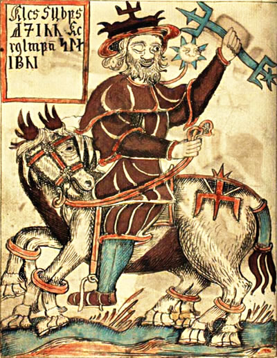 Dat is Wodan up sien Pierd Sleipnir. Sleipnir hett an elk Been twee Fööt!
