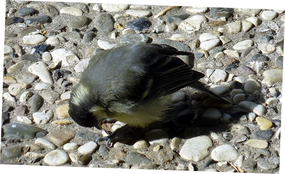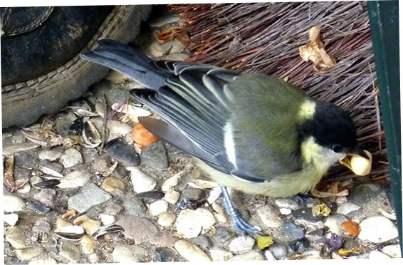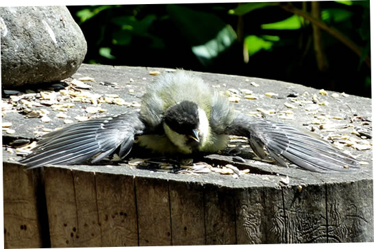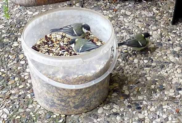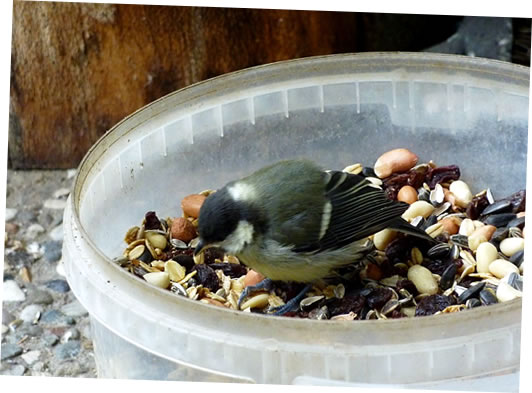 In de Eck vun de Terrass stünn doch en Ammer mit Vagelfoder. Dor fleeg ik eerstmal hin.