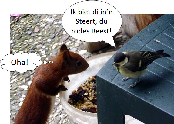 Dat kunn ik nich tolaten. Bang harr ik nich, ik heff mi ganz eenfach up den Hocker sett un em utschimpt. Aver he leet sik nich stören, stell sik up de Achterbeen un haal sik vun dat Vagelfoder!