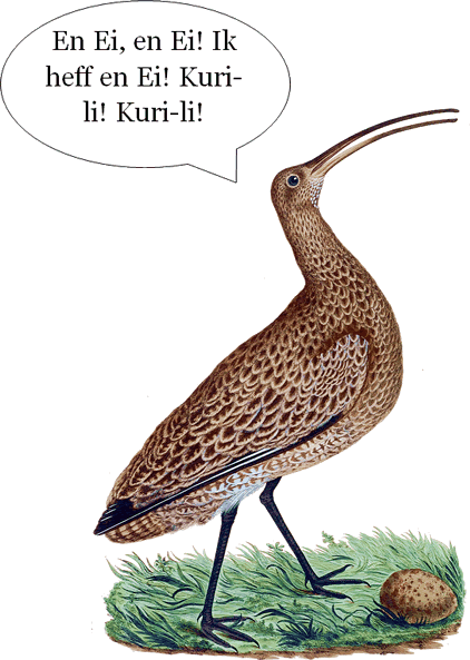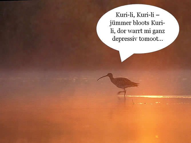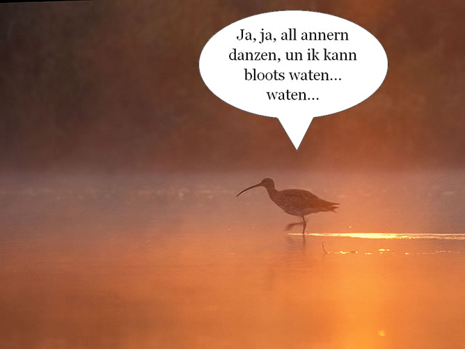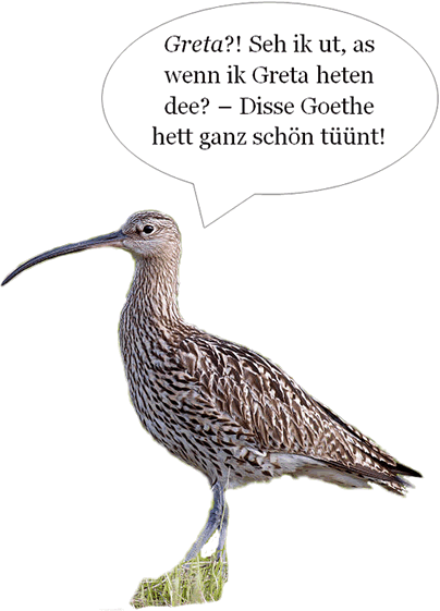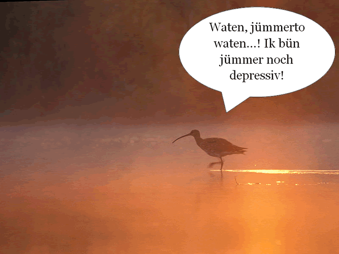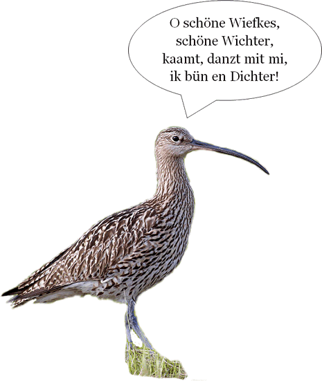 See sünd de Gröttsten: De Grooden Broakvöägels Groode Broakvöägels sörgen in d' Schliekland as Dieksvöörland föör een komodiged Musizeern. Wiet över de bi Leechwoater drööchfallenden Wieden tüschen de gröönen Penner butendieks un de blausche Woaterskant is hör fulled un doch weeked Kuri . Li to hörn. Dat dücht denn mennichmoal net so, as wenn de Natur in disse Landschkupp hör foaken schwoare Seel hören lett. Up de ingelsch Eilands an de Westersied van de Noordsee hevvt de Minschen de groode Bröäkvoagel wägen siene Luuden ok woll Cur-lew wat man as körlju schnakkt nöömt. Ikk moot oaber ingestoahn, dat mi de Noam, de use groode Dichterskeunich Goethe hör to siene Tiedgääven hett, veel lichter un gefalliger över de Tung geit Greta hett he de stollten Deerten mit de övergrooten boagen Frätwaaarktüügen nöömt, de in hör bruunsched Pennenkleed netso grood sünd as de Eierlärgers up use Hönerhoffen. Ünner de juropiensch Wat-Voagels (wat heeten schall, dat see as Störkens in Saloat dör dat Schliekland waten) sünd see de Gröttsten. Wiet buten vöör de Gröönlandskant sücht man hör nu allennich ov foaker ok woll in lüütji Drufeln noa wat to futtern in d' Watt rümstöäkern. De boagen Schnoabels sünd hör Waarktüch. Dormit hoalt see Schnirgen un Muschkels ut Huusen un Schillkers. In d' Märtmoant, wenneer de all Sünn hooger sticht un dat Vöörjoahr sükk bi us breetmoakt, denn trekken de grooden Broakvöägels de Gretas, as see noa Goethe heeten üm. Denn pflöstern see aal mitnanner van Buterdieks in d' Binnerland, in d' Schuul van Moorrebetten un fuchtiged Gröönland achter de hoogen Dieken. Dor blieven see solaang, as bit de Joahrstied de Maienmoant to foaten kricht. Vuller Överdürichkeit kennteeken de Mannslüüd ünner de Gretas nu mit hör up un doal Gesangsluuden in veele Riemsels hör Karteer föör de tokoamende Nüsseltied. Foaken stoaht see bi hör Trippelee denn tomal as een bruunschen Richelpoal mirden in d' Gröönland. Dat is föör de Wiefkers dor ümto woll een besünner Teeken kummt näämich een van de Froonslüüd in siene Nöächte, faangt he an, sükk as een Danzboas to tierden. He trippelt üm hör to, häävt de Flöägels un moakt de Steertpennen breet, as wenn he fleegen deit. Wenneer twee sükk denn eenich sünd, wat mitnanner antofang'n, wiest he hör Stükk ov wat Nüsselstäen, de he vöördem all föör de Tied noa de Hochtied as Huusstää utkääken hett. See, dat Froominsch, hett dor oaber dat letzde Särgen van Joa ov Nee, wiel bi hör de Säkerheit un de Schuul föör dat to verwachtende Jungvolk vörgeiht. Mannslüüd seegen dat schients aal een bäten anners. Dat düürt nich laang, denn nüsseln moal See un moal He ovwesselnd up tomeist veer häntige bruunsche Eieren. Üm de Nüsselstää nich to verroaden landen de Öllern wiet van d' Nüst wäch up de Grund, un stiegen van dor ok wäär up in de Lücht, wenn see sükk bi d' Bröden ovwesselt hevvt. Noa de Düür van een Moandentied van 28 Doagen rööcht sükk neeäd Lääven in dat Nüst. Wenn dat letzde Keuken de Eierschillen losworden is, denn verloaten de Jungen mit hör Moder dat Nüst, um för sükk wat to futtern to söken. Nu, wor dat hoch in d' Vöörjoahr is, is de Toafel van Moder Natur ja vull mit de beste Futteree. Man kann tokieken, wu dat Jungvolk van Dach to Dach mehr gereut. See bruken joa hoast ok blods hör Bekk uprieten un schluken. Würms, Spinkers, Mürgen un Fleegen givt dat genooch in de Woaterpolen un langs dat Gröönland. Noa een Tied van 4 Wääken hevvt de Jungvöägels hör vullstoadiged Pennenkleed an un köänt, bevöör see mit de Ollen trüch noa butendieks in dat Schliekland tüschen See un Land wesseln, noch eenmoal hör Kinnerstuv van boaben bekieken. |
