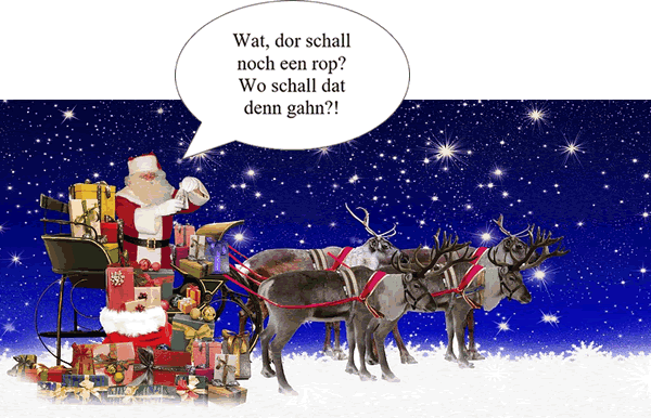 Düsse Stevelknecht mutt nu ja nu ok noch mit op den Sleren rop un bi jeed Tour mitfohren. Düsse Keerl bruukt je ok noch veel Platz op den Sleren, de ja för de Geschenken dor ween mutt. Nu in noch weniger Platz op den Sleren für de velen, velen Geschenken för de leven Kinner op de Eer un de Wiehnachtsmann mutt dordörch ok noch bannig veel mehr Touren vun sien Wiehnachtshütt to de Kinner maken un för grote Geschenken is faken keen Platz mehr, düsse Geschenken blievt denn stahn för ... ja, villicht för de neegsten Wiehnachten.