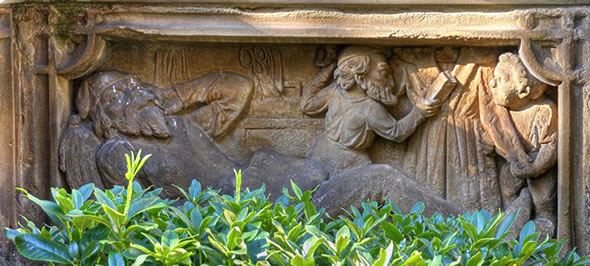 enen Brunnen buut un ehr Daun in Sandstein haugt.
