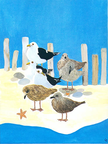 kaakt, good in de Supp smecken. Also ok keen Fisch in de Supp. Da kümmt Seehund ansliekert, he hett en Strandlöper fungen. "Pfui", röppt Talke, "laat em los, süss..." Ganz füünsch kiekt se Seehund an. De Strandlöper is nich versehrt, bloots beten benusselt, un sin Hart puckert as verdull. De lütte Hex puust ganz sachen den Sand af un wischt de Kattenspucke vun sin Feddern. Liesen fangt de Strandlöper to fiepsen an, un denn löppt he, so fix as man geiht, na de annern Strandlöpers.