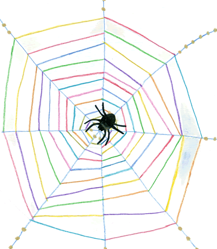 "Hopsa, Popsa, Schnopsa", se snippt mit den Duum un de Middelfinger, un Louisa, de Krüüzspinn, de bi ehr överwintert, kiekt ganz verbaast op ehr Spinnennett. Dat süht miteens so annershaftig ut. De Spinnenfadems sünd nich mehr witt, sünnern bunt. Rood, blaag, gröön, orange un vigelett lücht se, un an'n Rand blenkert Parlen. Verfehrt jumpt se bikant un verstekt sik achter de Tassen, de an de Wand op Hokens bammeln doot.