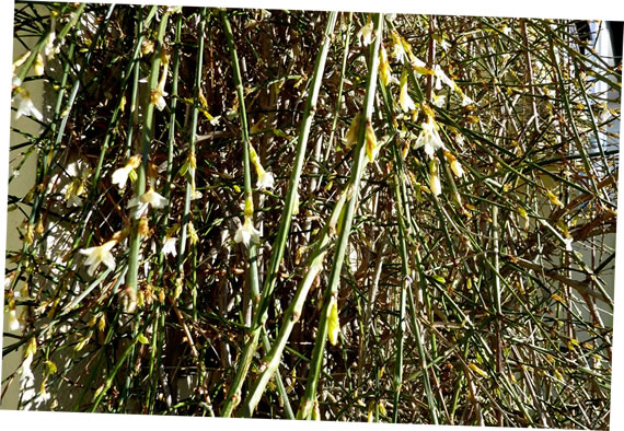 Wat ik dor to sehn kreeg, hett mi richtig trurig maakt. De Winterjasmin harr meist all sien Blöden verloorn. De letzten leten de Köpp hangen un weern vun den Frost ganz bleek woorn! 'n poor Knubben weern noch dor. Villicht bringt de Sünnenschien se noch in Gang.