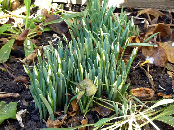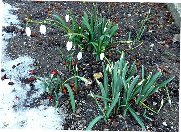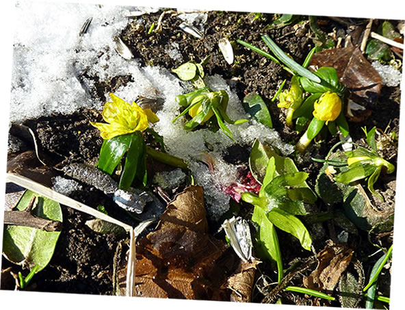 Ok de lütten Winterlinge harrn de Küll goot överstahn. Ünner de Sneedeek harrn se sik versteekt un keken nu mit ehr lütten licht utfransten Köpp in de Sünn.