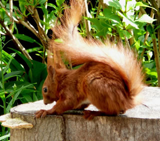 Ganz boven in't Dack wüllt de Boomkronen an't Licht. De hogen Boomstämm sünd de Sülen, de dat Dack draagt. Hier in't Dack sünd vele Vogels un ok de Eekkoter tohuus, de nüüdlichen Eekkoter, de ji so geern lieden möögt — se susen de Böömstämm ropp un rünner, dat süht to seut ut. Se versteken in Moos un Loof Bookeckern, Hasselnööt un Eckern al för den Winter, as Foder-Reserve.