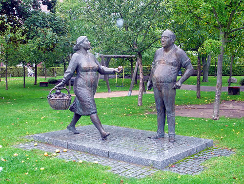 Wat dat mit dat Paradies op sik hett, weet wi ut de Bibel. Eva hett Adam angeblich dorto verföhrt, den Appel vun den "Baum der Erkenntnis" to eten as Straaf sünd se ut dat Paradies verdreven woorn. Aver de Adam, al beten öller un mit en Wohlstandsbuuk, den de Bildhauer Gerhard Brandes (boren 1923 in Frankfurt/Oder, storven 2013 in Hamburg) 1999 maakt hett, kümmert sik weder üm Eva, de enen ganzen Korv vull mit Appels driggt, noch üm den Appel, den se em anbeden deit. He kiekt beid nich mol an! Un dat süht so ut, as harr se de ganzen Appels ut den Goorn alleen opsammelt! Un he steiht man blots so in de Gegend rüm. Dorbi heet doch dat ingelsch Sprickwoort: "An apple a day keeps the doctor away". Op Düütsch: Een Appel jeden Dag, dat höllt den Dokter af ... Hett Adam Bang, dat de Appel, as in dat Märken "Sneewittchen" vun de Bröder Grimm, vergift is? Oder, as dat so schön heet, dat dor "de Worm binn is"? Oder hett he gor dat Leed vun Wencke Myrrhe in sien Ohr, de 1966 sungen hett: "Beiß nicht gleich in jeden Apfel, er könnte sauer sein ..."? Kann uk ween, dat he Angst hett, dat de Appel em in'n Hals stecken blifft un de Kerl denn 'n "Adamsappel" kriggt. Denn köönt wi höpen, dat de versmaden Appel nich to'n "Strietappel" ward.