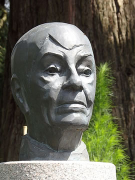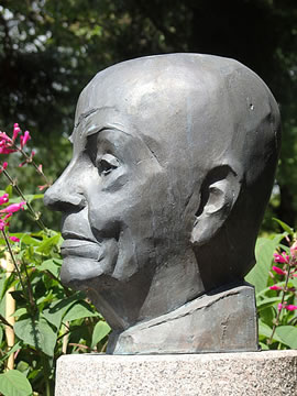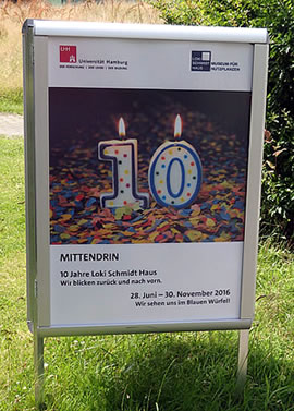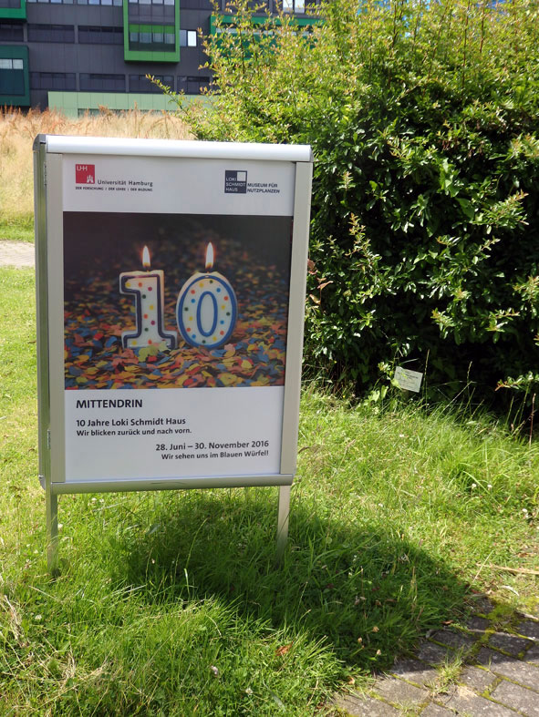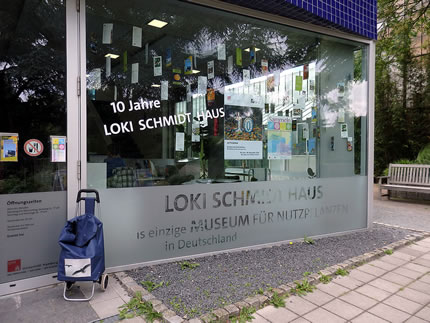 Man dat gifft nich blots de Büste vun ehr, sünnern vun den Hauptingang, an de Büste vörbi, den Weg beten na links, steiht dat Loki-Schmidt-Huus. Dat blaue Huus is op dat Foto hier links achter'n Boom 'n beten to sehn. Lokis Kopp an de rechte Siet süht in Richtung na "ehr" Huus. Dat Loki-Schmidt-Huus is dat eenzige Nutzpflanzenmuseum in Düütschland un fiert jüst den 10. Geboortsdag.