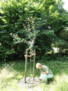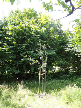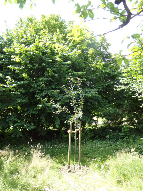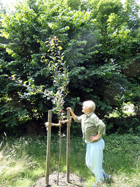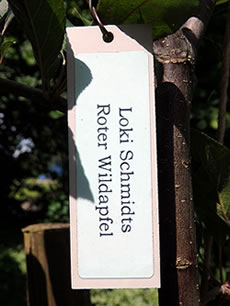 Mehr to de Apfeltage, de an'n 24. un 25. September 2016 stattfinnen, is hier to lesen. An 23.9.2016 is al en Tagung Apfel & Gesundheit, un an den 25. September 2016, Klock 10.00, beginnt en Föhrung dörch den Botanischen Goorn. Also: rechttiedig den Termin in'n Kalenner opschrieven un denn man los in den wunnerschönen Loki Schmidt-Goorn! Dor köönt Se denn uk in den Nutzgoorn Loki Schmidts Boom ankieken, den Roten Wildapfel. Düsse lütte Boom is vun de Gesellschaft der FreundInnen des Botanischen Gartens inplant woorn. Eva, dat is een vun de Fruunslüüd, de dor arbeiden deit, hett mi to düssen Boom hinföhrt, un Maija hett tolaten, dat ik eer bi't Arbeiden fotografeer.