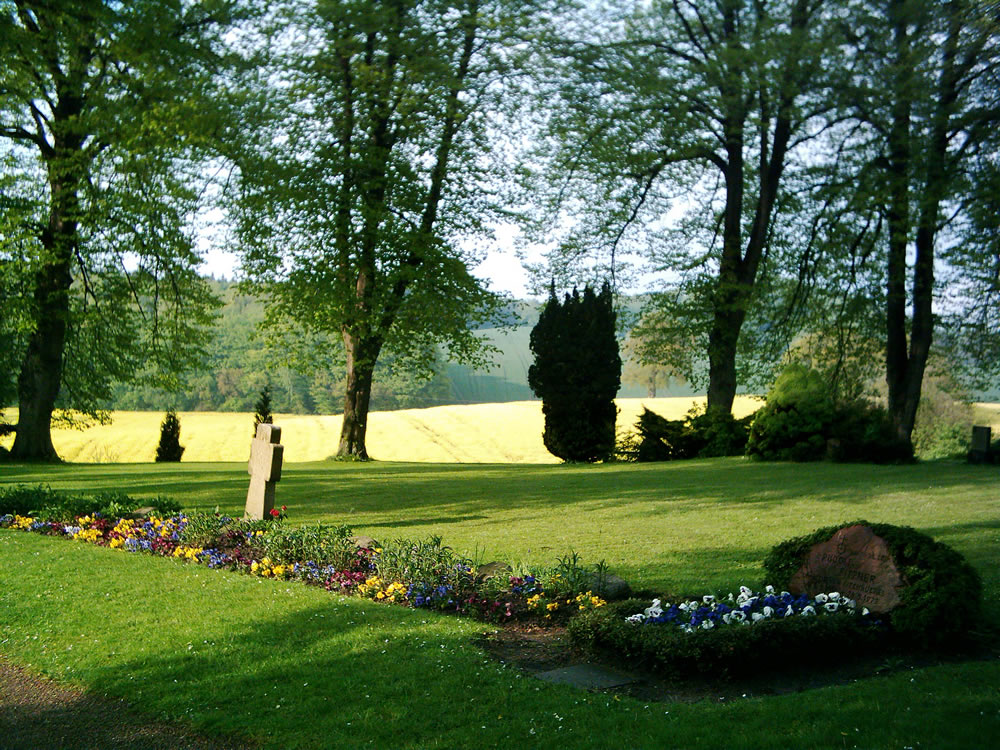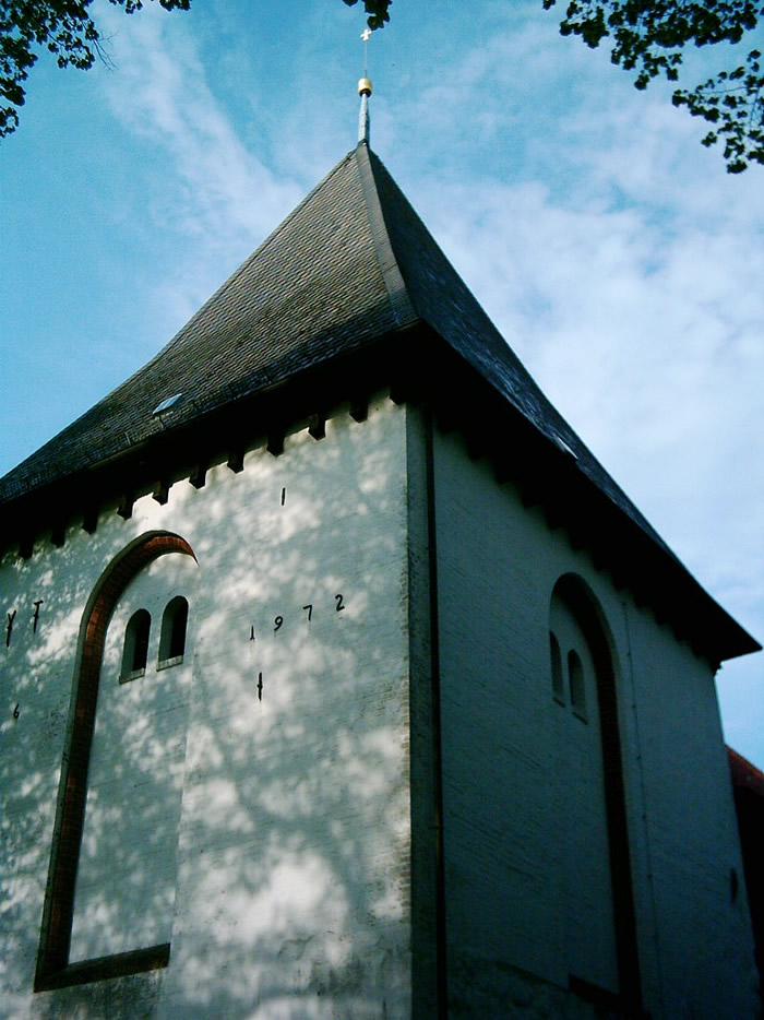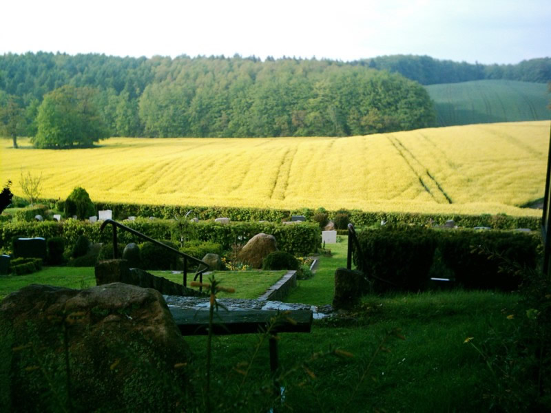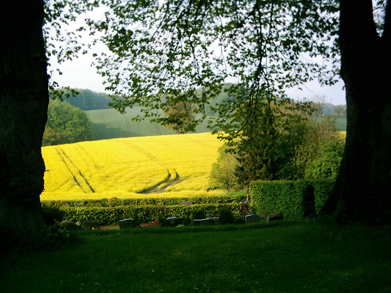 De Kark liggt op en lütten Knüll, as ole Karken doot; allens hier is lütt, un dochen stekt achter düt Lütte wat Groots, dat een överall föhlen kann. So is dat ok, wenn een buten üm den Karktoorn rümmer driselt na den achtern liggen Karkhoff hen. As en Slag in't Gesicht drept di denn toeerst de Leevlichkeit vun de Landschap, de dör de Bööm lücht; dat is meist nich to glöven, as stünn een sülven in en Bild, un wenn nich de Duft vun den blöhen Raps dor weer, wöörst dat wohraftig för maalt hollen. 'keen Leder kennt, den fallt de Reegn vun den lübecker Dichtersmann Emanuel Geibel in: