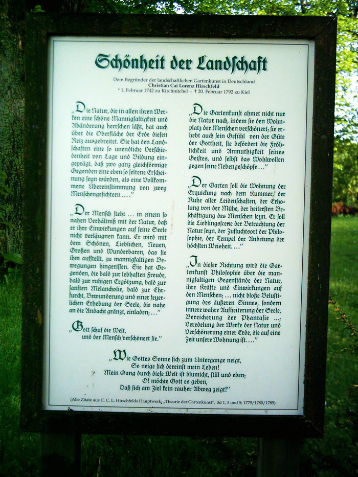 Bruukt heff ik dat Book "Christian Cay Lorenz Hirschfeld eine Biografie" vun Wolfgang Kehn, Wernersche Verlagsgesellschaft Worms 1992. En gode Websiet is de vun Graf-Gartenbau. |