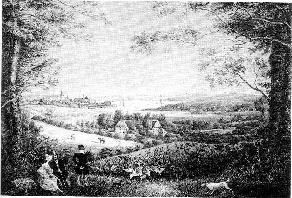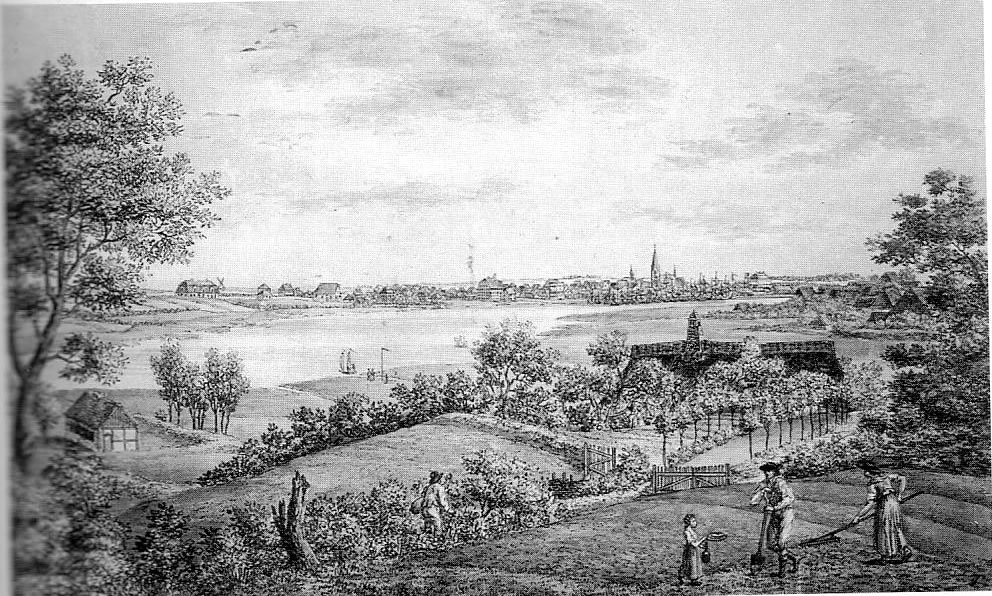 ehr Titel al wiest, in welk Richt sin Gedankens gaht. "Da 1769 is sin Roop so anwussen, dat he wedder dör Vermiddeln vun den Adel, dütmaal vun Zarin Katharina en faste Stellung as Philosophie-Perfesser an de Uni Kiel anbaden kriggt. Na Huus, na Holsteen! Krischan tögert nich. Kiel is dormalen en idyllische Lüttstadt, meist en grötter Dörp; wi köönt us hüüt gor nich utmalen, wa ländlich dat dor noch togüng, man de Biller hier nerrn deelwies ut latere Epochen! wiest dat. To Hirschfeld sin Tied mutt dat noch lauschiger west ween. (Se köönt de Biller dör Klick vergröttern.)