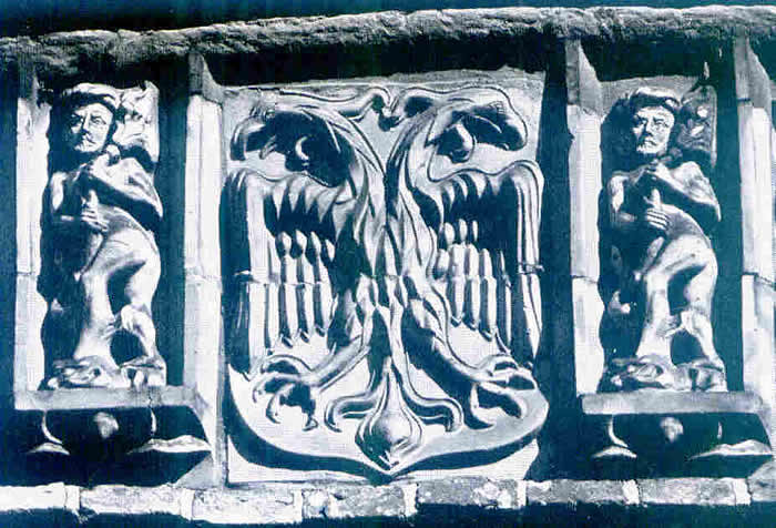 Wappen to sehn, root un witt, un de Adler. Dorto twee Jahrestallen: