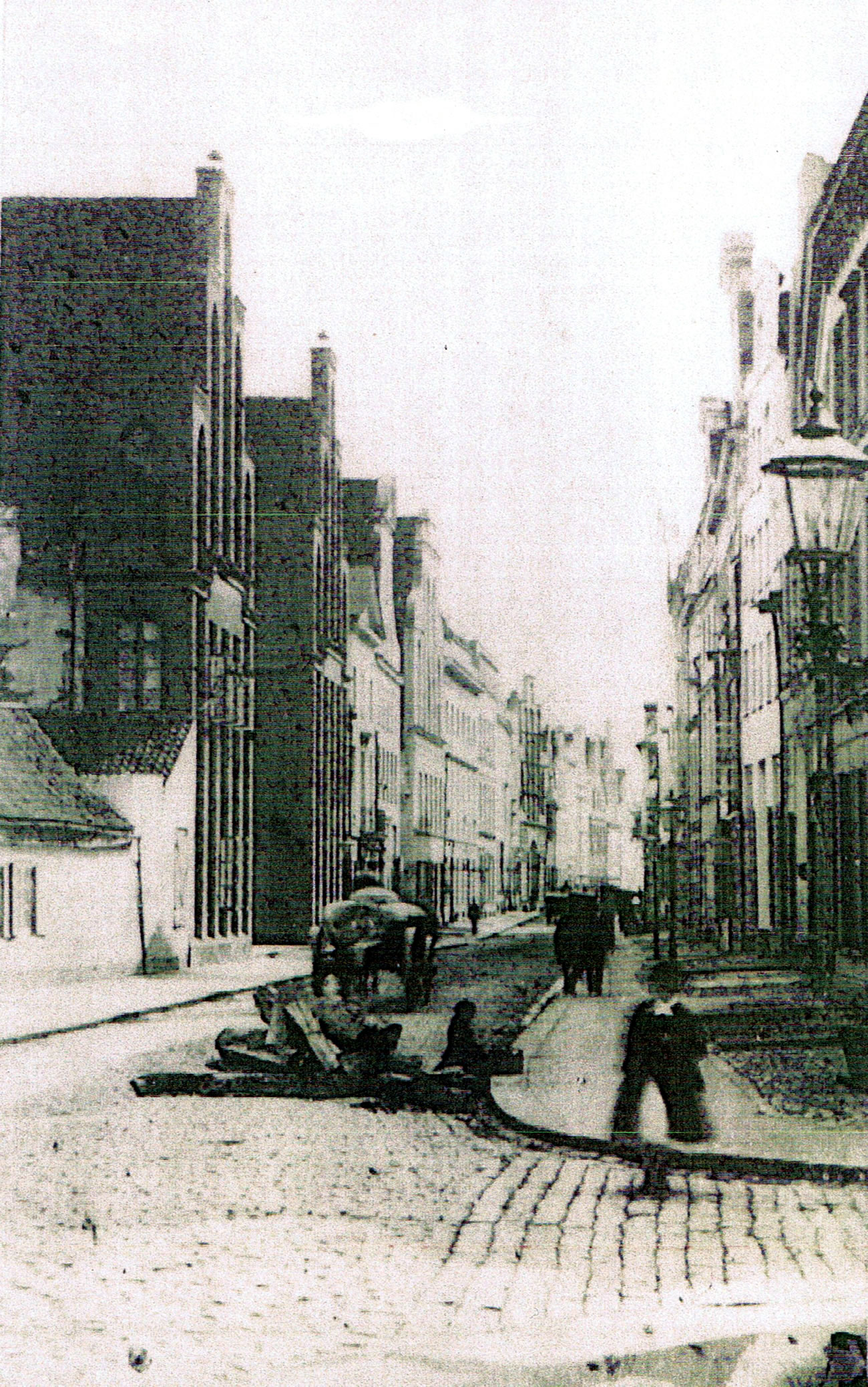 Nu weer dat in dat olle Lübeck so, dat de Straten nich överall un gliekmäßig enen fasten Grund harrn. Jeedeen Huusbesitter harr de Plicht, de Straat vör sien Huus in Ordnung to hollen, dat heet, so breet as sien Huus weer, avers man de een Hälft vun de Straat, för de anner Hälft weer de Naver gegenöver tostännig. Nu kost Stratenbuu veel Geld, so en Huusbesitter hett dor dat Geld nich geern för utgeven. Dorüm süllt de Straten in uns Stadt in enen jämmerlichen Tostand west sien. Wenn nu aver mal en Peerd orrer en Koh up so en Straat to Schaden kamen weer, denn müß de Huusherr betahlen. Müß nu würklich mal wat daan warrn an Weg un Straat, denn weern dat oft Arbeitslüüd, de nix kunnen, "Fuscher". Dorto keem de Verkehr mit swore Peerwagen, Brennholt wörr afkippt up de Straat un dor ok twei haut. Keen Wunner, dat de Straten leeg utsehn hebbt. Allns dat hett man de Steenbrügger vörhollen. 1786 hett de Buuhoff hüüt seggt wi Buuamt mit Straaf droht; se wullen sogoor dat Amt uplösen. De Steenbrügger sullen de Straat graad un överall gliek maken, vör dat en Huus nich höger as för dat anner. De Rönnen vör de Hüüs un dat Siel över de Straat sullen so sien, dat Water goot aflopen kunn, de Afwies-Steen sowat as Poller sullen nich wieder vun de Hüüs af as vörher. Den Siedenweg de Footstieg hebbt de Huusbesitter mehr un mehr för sik bruukt. Dor stünnen Bislääg, so as hüüt noch hier vör de Schiffergesellschaft, de Togänge to de Keller weern dor un de Lüüd hebbt Linden plant. 1788 hett de Buuhoff enen Steenbrügger ut Kiel instellt, de sull an 't Borgdoor plaastern. De Lübecker Steenbrügger hebbt sik över sowat dull beklaagt. Ganz böös weer dat in de Franzosentiet un dorna. Keen Stadt harr so wörr vertellt so böse Straten. De Steenbrügger müssen för den Buuhoff arbeiten. Dor kunnen se männichmal nich ehr dääglich Broot bi verdenen, denn müß de "Huusfru" de Ehefru as Topleger helpen. 1827 hett de Buuhoff de Königstraat plaastern laten mit sien egen Lüüd. Wedder hebbt sik de Steenbrügger beklaagt. Wat kregen se as Antwort? "Ein hoher Rath hat das Gesuch der Bittsteller einstweilen ohne Dekret hinzulegen verordnet." In de Rull steiht: "Rönnstein von Brettern und Steinen legen." Dat weern Rönnen för de Entwässerung, de lepen dwars dörch de Hüüs. Hans Calm schrifft üm 1870 in sien Book "In Lübeck stand mein Vaterhaus":