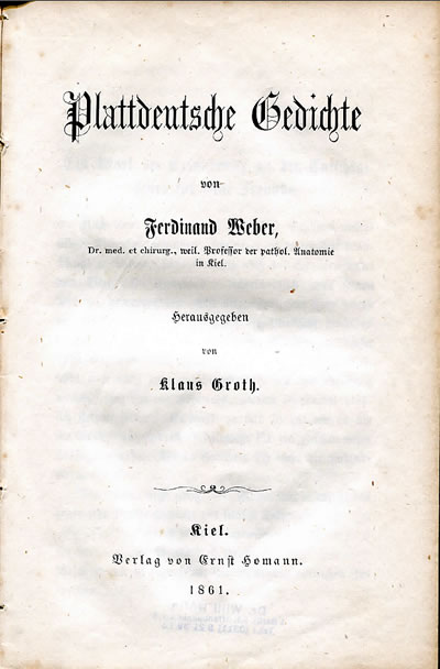 Weber weer en gode Fründ van Groth, de berichtet: "Bei der Herausgabe bin ich ganz wie mit meinen eigenen [Gedichten] verfahren, überzeugt auf diese Weise genau im Sinne meines Freundes gehandelt zu haben. Der Leser bekommt ein durchaus ungetrübtes Bild des Heimgegangenen, und wenn er dabei vielleicht mitunter an meine Weise erinnert werden sollte, so ist dies nicht meine Hand, sondern die Ähnlichkeit zweier Landeingebornen im Denken und Empfinden, in der Liebe zu Volk Land und Sprache, die wir mit Stolz unsere nennen, eine Ähnlichkeit die der Nachbleibende wie der Vorangegangene als das redendste Zeugnis unserer Freundschaft betrachtet." Groth, de mit den "Quickborn" 1852 de nedderdüütsche Spraak weder to literarische Ehren brocht harr, keem nich up de Idee, sien Woort vöraf up Platt to schrieven; in'e Merrn van de 19. Eeuw kunn dat woll noch nich angohn. Dat Groth in sien Tied de Spiritus rector van alle Bemöhen üm dat Plattdüütsche weer, tominnst in Sleswig-Holsteen, dat wiest sik sünnerlich an Fründ Weber siene Versen. Se sünd van Groth siene Gedichten in de Form meist nich to ünnerscheden. Bi't tweete Lesen markst du denn, wo de Ünnerscheed liggt: Groth is en Dichter, Weber is en Hobbyschriever. Dat riemt sik nett un hett de gaatlichen Versfööt man wenig steiht daar in. De Anatomieprofessor is en Bispill för den Loop van de plattdüütsche Lyrik in de 19. un 20. Eeuw: De Schrieverslüüd hollt sich an Groth fast, un wat Nieget in Form un Inholt in de hoochdüütsche Lyrik upkamen dee, daar scheert sik dat Nedderdüütsche meist nich üm. Utnahmen gifft dat, dat weet ik woll; man de sünd alltiet roor. En egen Toon findt Weber, wenn he över sienen Hund Kule schrifft: