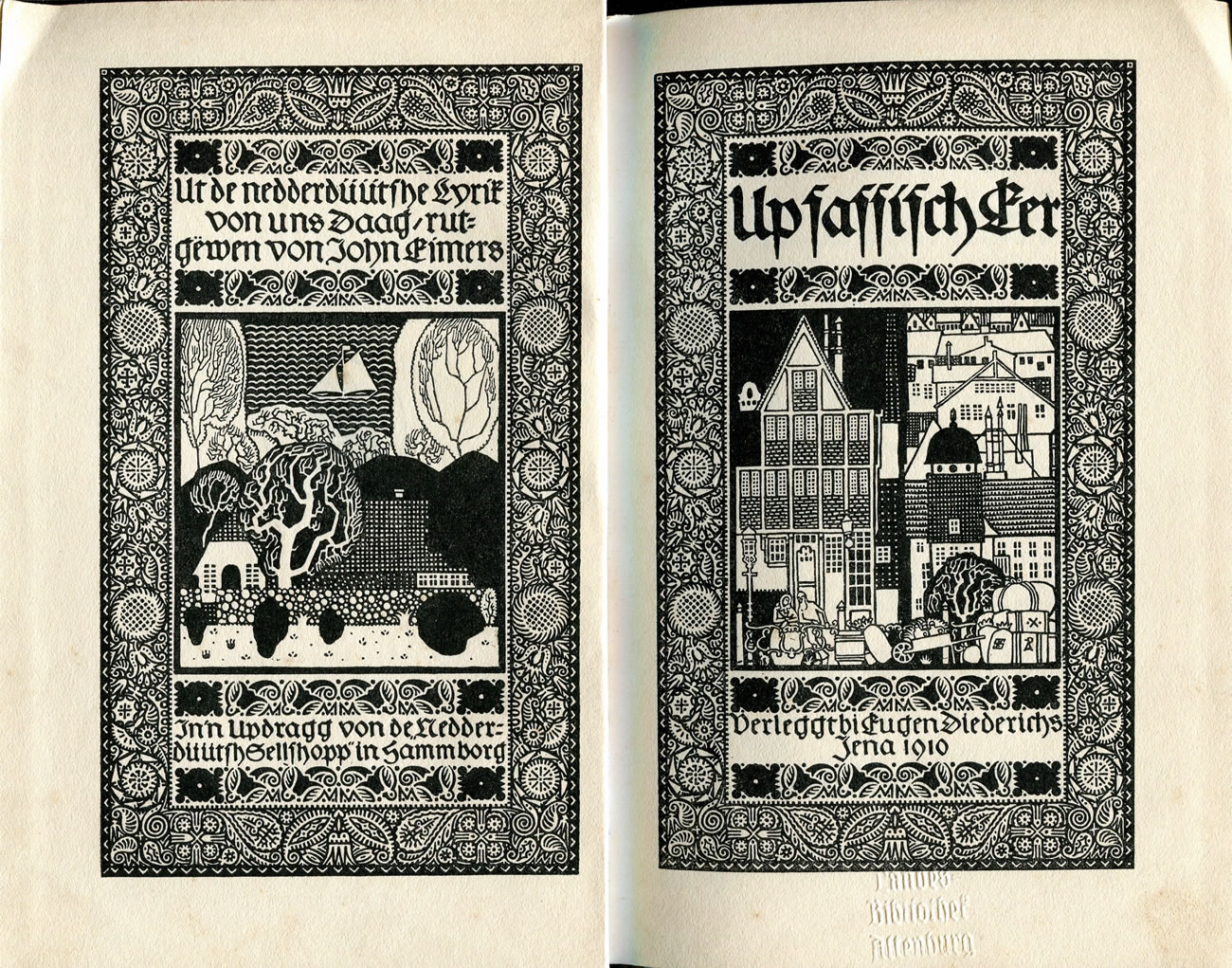 van Willi Höfig Up sassisch Eer: ut de nedderdüütshe Lyrik von uns Daag, rutgeven von John Eimers in'n Updragg von de "Nedderdüütsh Sellshopp" in Hammborg. Verleggt bi Eugen Diederichs, Jena 1910. Dat Book is vör 105 Johren in Jena druckt worrn. Verleggt hett dat Eugen Diederichs, de Weert daarup leggen dee, dat siene Böker goot antosehn un antofaten weern (un ok goot to lesen, man dat versteiht sik van sülben). Un so kannst dat denn ok hüüt noch geern in de Hand nöhmen. De Inband is 'n beten smuddelig worrn, un de een of annere Siet hett 'n Eselsohr afkregen. Daar harr männicheen sien' Kopp rinsteken, dat hett nich blots in't Schapp stahn. Un denn hett dat ok wat dörmakt: Kofft harr dat Börries von Münchhausen, de Balladendichter. Ehr dat bi mi landt is, stunn dat noch in de Landsbibliotheek in Altenborg. Kunn woll sien, dat Börries siene Böker daar henbrocht worrn, as he sik 1945 op sien Slott Windischleuba ümbrocht harr he weer Nazi un kunn sik woll utreken, wat em passeeren woor, wenn dat Drüdde Riek to Enn keem. De Thüringische Landesbibliothek Altenburg warrt 1951 dicht maakt; överblewen is de Stadtbökerie, de mit plattdüütsche Böker so recht nix antofangen weet, denn in Oostthüringen gifft dat keen Platt. Ik heff dat Book in de 1980er Johren in't Antiquariat kofft.