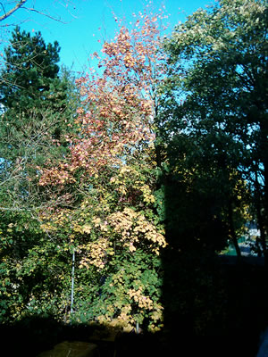 de halbeerte boom dat gröne liggt in schadden, dat rode in de sünn; |