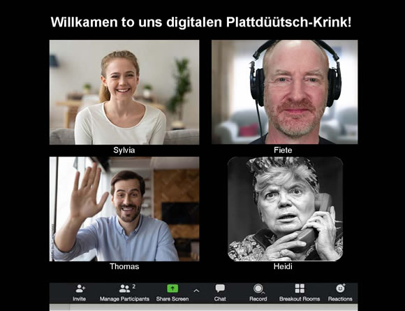 Wi sünd en Krink vun 25 Plattdüütschsnackers, de sick siet twee Johren jeed twete Week op Videolink drööpt, üm över verscheden Saken to snacken, praten un küren also en Twüschending mang AG un Stammdisch! Dat Besünnere: Dien Platt mutt nich perfekt sien wi sünd tomeist all eerst korte Tied Plattsnackers orr lehrt dat noch! Wi wüllt eenfach en beten Praxis hebben! Un: Dien Dialekt is ok egaal wenn düt hier nich "dien Platt" is, kaam liekers rin un snack mit! De Deelnahmers wahnt in verscheden Delen vun Düütschland, Skandinavien un Brasilgen, un wi hebbt uns al veertig Mal drapen. Jeedeen Deelnahmer kann egen Saken bidragen. Op düsse Wies hebbt wi to 'n Bispill al vun unse Hobbies vertellt, Geschichten leest, Böker vörstellt, Theater speelt, sungen un tosamen veel Pläseer hatt!
