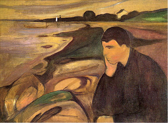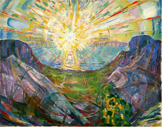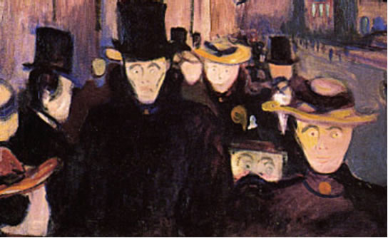 Kannst nich glöven, is aver wohr: An't Enn stünn de Faschismus, de nich blots de "entartete Kunst" tweimakte, sünner ok de Juden ümbröchte, uns Eerd in Brand sette, Noot un Doot över de Eerd bröchte. Blieven wi aver bi Edvard Munch in sien Tiet. Wi erinnert: De Natuur un dat Üm un Bi speigeln bi Caspar David Friedrich wedder, woans dat binnen in den Minschen utsüht. Un dat passt tosamen. Natuur un Welt un Minsch gifft nu bi Munch aver keen Tosamenhören mehr. Dat Gegendeil passeert: Dat Alleensien vun den enkelten Minschen ward jümmer grötter. Munch maalt ok nix ut de Groten Vertellsel as de Bibel un vun anner mystisch groote Weltvertellsel. Hei seggt: "Ik maal, wat ik seihn heff un wat mit mi geiht un wat in mi wöhlt.." Un dorbi stütt hei sik up den Gloven an de Natuurwetenschop un de Künnigketen vun disse Wetenschop. Güllig sünd de Gesetten vun de Natuur. "Materie" kannst nich twei maken, se verännert blots ehr Form. Dat groote All, dat Universum, is een Einheit vun Geist un Materie. De Uurgrund vun all de Materie is en Gott, de in allens to finnen is.- Wi jungen Lüüd hebbt na 1945, nadem de in een Deert sik wannelte gröttst Spießbörger Hitler und sien Spießgesellen weg weern, uns gegen een niege Spießbörgertiet wehrt-, un liekers faken verlorn.