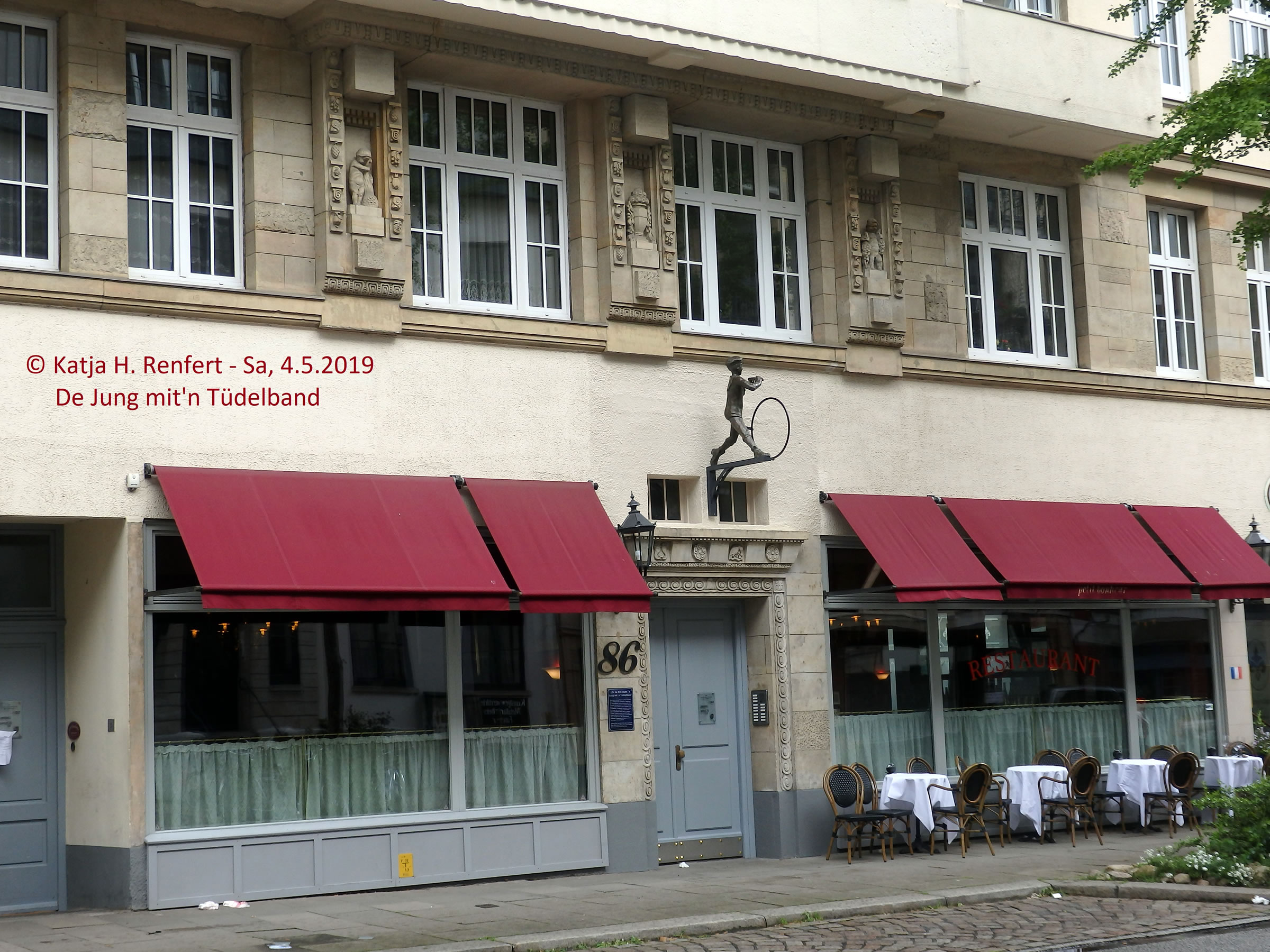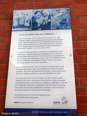 Trüch kaamt Se denn mit den Zurück-Knoop op de Browser-Symboolliest. Gistern, an'n 4. Mai 2019, woor in Hamborg in de Straat Hütten 86 fierlich de Bronze-Skulptur Der Jung mit dem Tüdelband vun den Künstler Siegfried Assmann enthüllt un inwieht. Siegfried Assmann, de in Groothansdörp wahnt, is bekannt för sien Arbeiten in Bronze, avers ok för Glasmalerie un de Gestalten vun moderne Karkenfinster. Un woso woor utrekent düsse Skulptur utrekent över düt Huus opstellt? Wieldat hier, in Hütten 86, Ludwig Wolf wahnt hett, een vun de "Gebrüder Wolf", de dat wiedhen bekannte Hamborger Leed An de Eck steiht 'n Jung mit 'n Tüdelband maakt hebbt. An em un sien Bröder schall de Skulptur erinnern. (Hier de Bericht över de Bröder Wolf vun Dieter Guderian, en Nafahrn vun en Wolf-Broder, de leider doodbleven is.) Ut Sweden is dorför ok Ludwig Wolfs Dochter, de 90-jährige Lieselotte Höbejögi, anreist. In dat smucke Huus is hüüt en Restaurant-Café, to kennen an sien rode Markisen.
