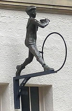 Hüüt kennt wi düt Speeltüüch as "Tüdelband", un dorwegen is dat good, dat düsse Skulptur dat richtig wiest: "Tüdelband" is en Verdreihn, villicht wieldat de Jung ja "in'n Tüdel" keem. Avers wenn he dor so stunn, an de Eck, apensichtlich jüst in Roh mit Band un Stock dor mutt he schon en rechten Töffel west ween, wenn he sik dormit so vertüdeln kunn, nich? Siegfried Assmann wiest uns den Jung mit dat Trudelband avers in vulle Aktioon, he steiht nich an'e Eck, sünnern drifft mit de linke Hand den Riepen, wieldess he in de rechte sien "Botterbroot mit Kees" höllt, un dat süht gor nich so ut, as wöör he bald in'n Tüdel kamen. Mit wied uthalen Schreed löppt he souverän blangen sien Riepen langs, bitt vun dat Broot af un kiekt mit sien plietsches Gesicht wied in de Feern. "Hamborg" steiht op den Striepen vun sien Matrosenmütz. Ja, Assmanns Figur hett en Matrosenantoog un Stebeln an, dat weer typisch för de Tied üm de Johrhunnertwenn bet to'n eersten Weltkrieg de grote Tied vun de Bröder Wolf. Bi de Fierstunn mit vun de Partie weern natüürlich ok de Künstler sülvst, de Intendant vun't St.-Pauli-Theater, Ulrich Waller, de Schauspeler Peter Franke, de al in Ulrich Wallers Wolf-Revue Die Jungs mit dem Tüdelband Ludwig Wolf speelt hett, un de Söhne Hamburgs (Joja Wendt, Rolf Claussen, Stefan Gwildis) för de Musik. Dat geev ok en lütt Verköstigen un natüürlich Äppel to'n Klaun un denn Ruckzuck övern Zaun "!