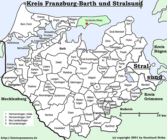 Gröön markeert: de Gemeen "Sundische Wiese" (Sunsche Wisch). De rode Punkt wiest dat Dörp, op dat dat Gedicht maakt is. För de Koort dankt wi