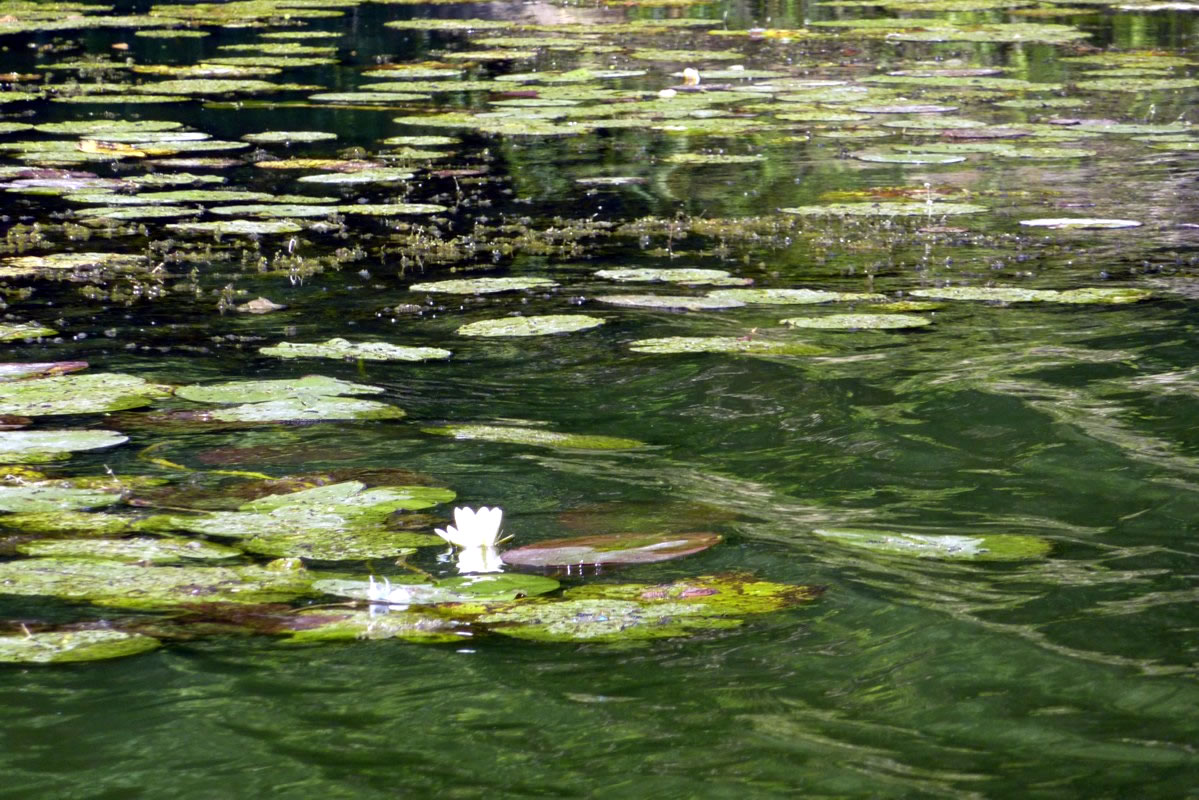 Bläder vun de Seerosen swevten hunnerte vun lütte Libellen.