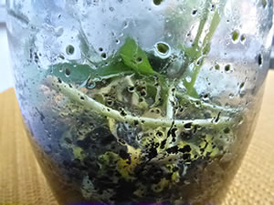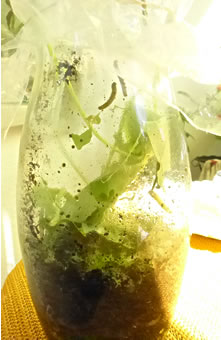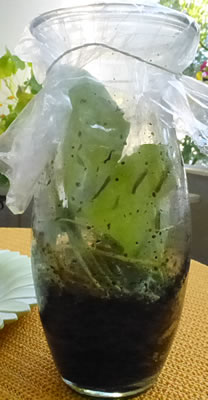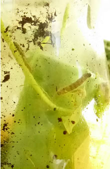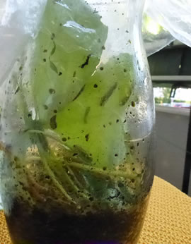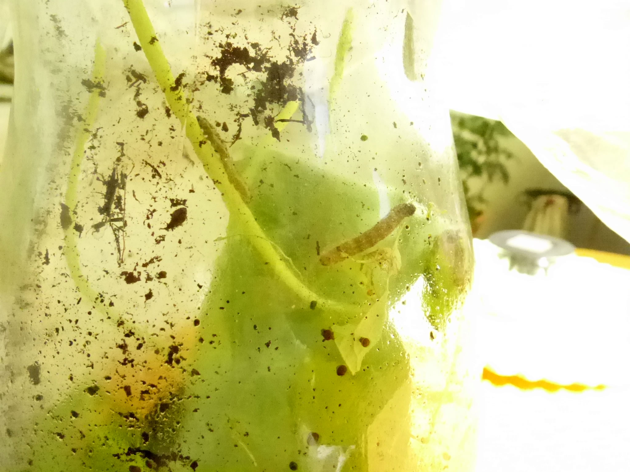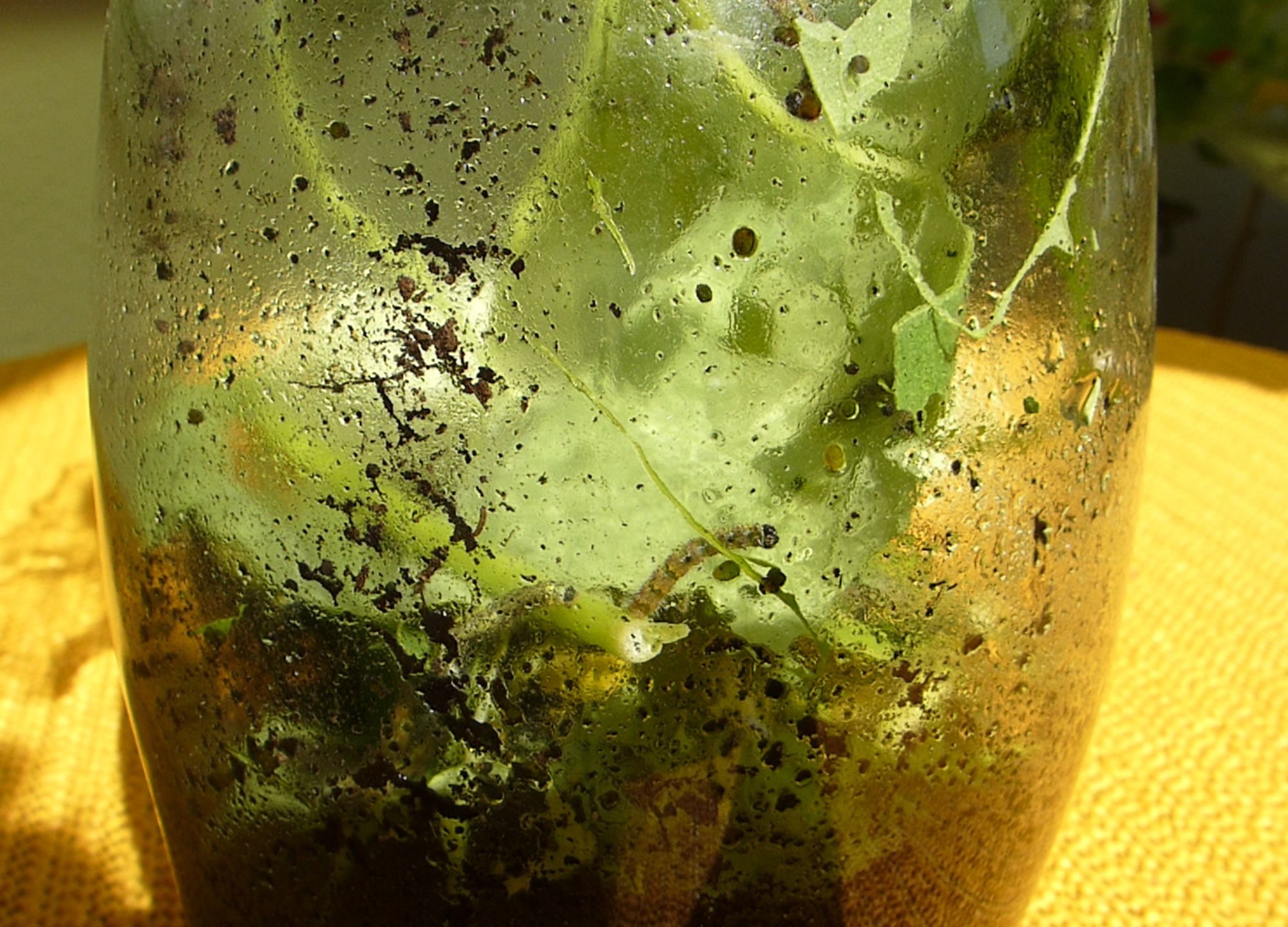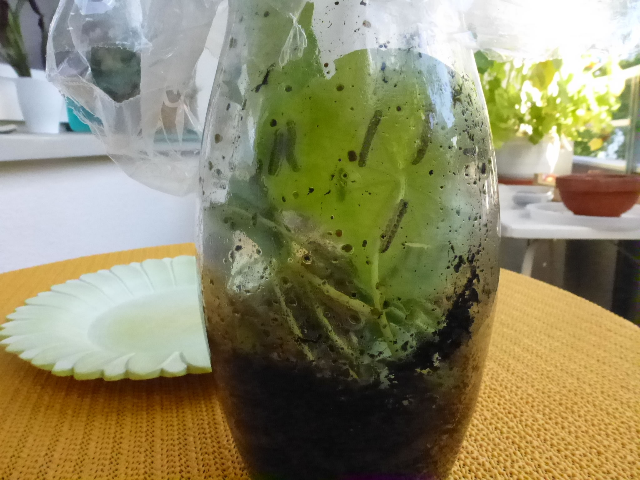 Ik heff so'n lütt Rupennest mit tohörig Bläder von de Kapuzinerkresse in en twee Liter grote dicke Glasvase sett, aver nich mit Water. Beten Eer toeerst op'n Grund dorto, dormit sik dat lütt beten as in de Natuur anföhlt. Baben heff ik denn Plastikfolie överbunnen un düchtig Löcker rinsteken. All Neeslang heff ik mi de niege Botterlicker-Tucht ankeken. Wenn