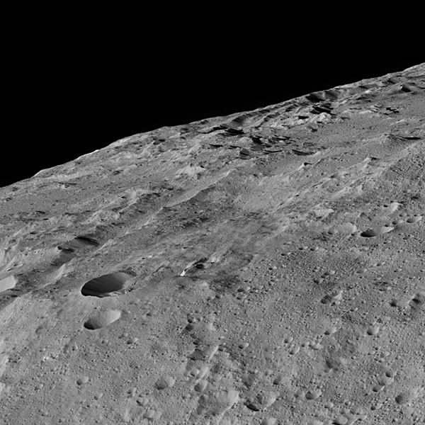 Binnen van einen Kraoter, Occator neumt, ligg dat lechteste Materiaol up Ceres. Occator sülwes hätt einen Dörmäter van 90 Kilometer, un siene middig liggen Kuhlen unner dit lechte Wark is rund 10 Kilometer breit un 500 Meter deip. Düster farwte Striepens, vellicht Bräkstriepens, loopet dwarsch dör dei Kuhlen. Äöwerbläben Deile van einen middig staohn Barg, dei woll 500 Meter hoch was, süht man uck noch. Rundümme löpp eine scharpe Kannte mit väle Terrassen un afflaogertet Eerd-Rutschk-Materiaol. Occator hört schiens tau dei jüngsten Strukturen up Ceres. Dei Maten van dei Dawn-Mission schätzet dat Öller up rund 78 Millionen Johre. Dat Jet Propulsion Laboratory (JPL) van dei amerikaonischken Weltruumbehörde Nasa hätt dat Leit äöwer dei Dawn-Mission. JPL is eine Affdeilung van dat California Institute of Technology in Pasadena. Dei Universität van Californien in Los Angeles stüert dei Wätenschup tau disse Nission. Dat Kamerasystem an Bord van dei Ruumsonde wörd entwickelt un bawet unner dat Leit van dat Max-Planck-Institut för Sünnensystemforschkung (MPS) in Göttingen tausaome mit dat Institut för Planetenforschkung van dat Dütschke Zentrum för Luft- un Ruumfahrt (DLR) in Berlin un dat Institut för Daotentechnik un Kommunikationsnetze in Braunschweig. Dat Kameraprojekt krigg finanzielle Hülpe van dei Max-Planck-Gesellschaft, dat DLR un dei Nasa/JPL. Dawn knipsde aff den 10. Dezember 2015 Biller van dei südlicke Hemisphäre van Ceres ut eine Hööchte van rund 385 Kilometer. Dei Sonde flög don up ehre leegste Baohn üm dissen Mini-Planet. Dawn flügg nu bit tauleßte bi disse Mission up disse Hööchte. Dat Uplösen van dei neien Biller ligg so bi 35 Meter up'n Pixel. Dit Bild van Ceres wörd ut einen leegen Ümloop knipset. Man süht eine Mosaik-Korte üm eine Kraoter-Riege, Gerber Catena neumt. In dat Nasa-Portal (süh Nasa-Portal) giff et uck eine 3-D-Ansicht (eine Rot-greun-Brille is nödig). Disse Ansicht van Ceres knipsde Dawn an'n 10. Dezember 2015. Man süht ein Deil van dei südlicke Planet-Hemisphäre. Dat ligg so bi 85,6 Graod up südlicke Bredde un 176,6 Graod up östlicke Längte. Up dit Affdeil van Ceres, duune bi den Südpol, schmitt dei Sünne orig lange Schaddens. Ut disse Perspektive seihn, steiht dei Sünne knapp an dei Kimmen. Bi dei Upnaohmetied van dit Bild stünd dei Sünne 4 Graod nördlick van den Äquaotor. Rund üm den Südpol van Ceres kann dei Sünne an einen nägen Stünnen duuren Cereanen Dag nienich hoch an den Himmel staohn. Dawn mök dit Bild ut eine Höchte van rund 385 km äöwer'n Ceres-Bodden. |