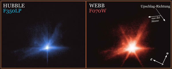Twei groote NASA-Obervatorien Draokenooge un dat Hubble Weltruum-Teleskop möken gliektiedich Upnaohmen van dit besünnere NASA-Experiment. Echt historisch! Dat Bild hier nerrn wiest dei Upnaohmen van Hubble un Webb-Draokenoge. In dat lünke Bild kannst erkennen: Et giff einen lechten Näwel üm den Punkt, dei dat Didymos-Dimorphos-System is, tausaome mit fief Bögespitzen.