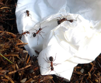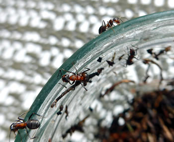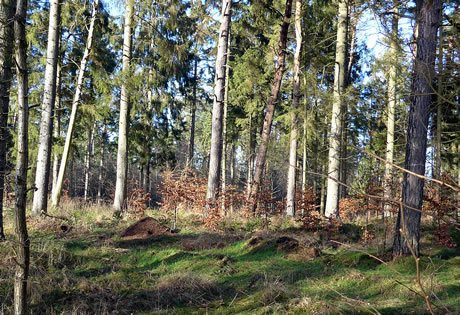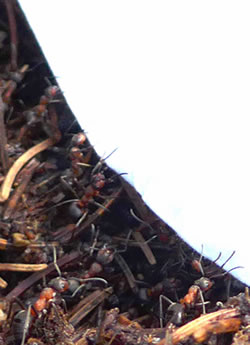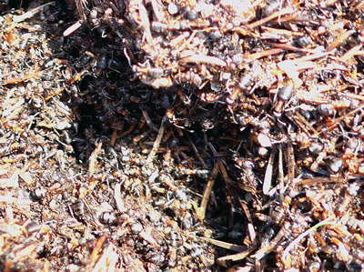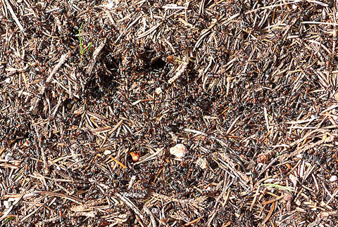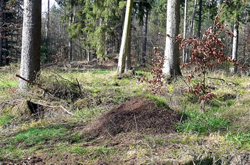 Al mit den tweeten Besöök vun de Eemkenhügel harr ik Erfolg. De Eemken weern upwaakt. Liekers dat veel Regen geven harr, weern se fliedig an't arbeiden. De Hügel harr dörch den velen Regen en düsterbrune Farv. De Regen weer in de Löcker lopen. Aver de Eemken leten sik nich bremsen. Vun ünnen weern se gemeensam dorbi un schöven de Dannennadeln na baven.