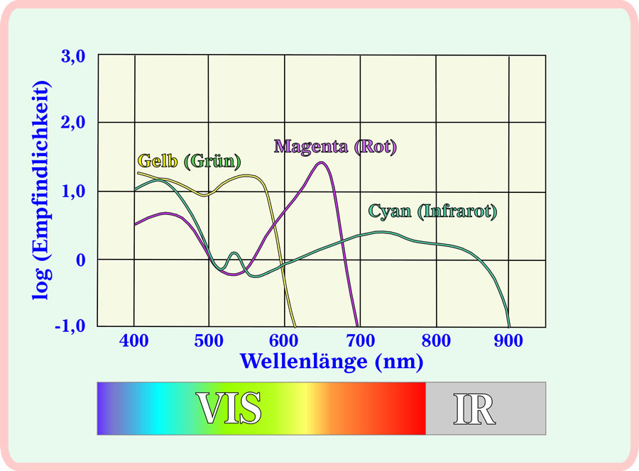 Laoge (Cyan) uk för IR-Lecht sensibel is. Se köönt dat Bild