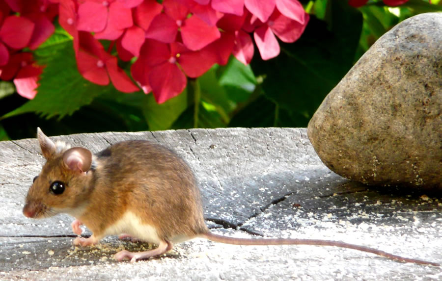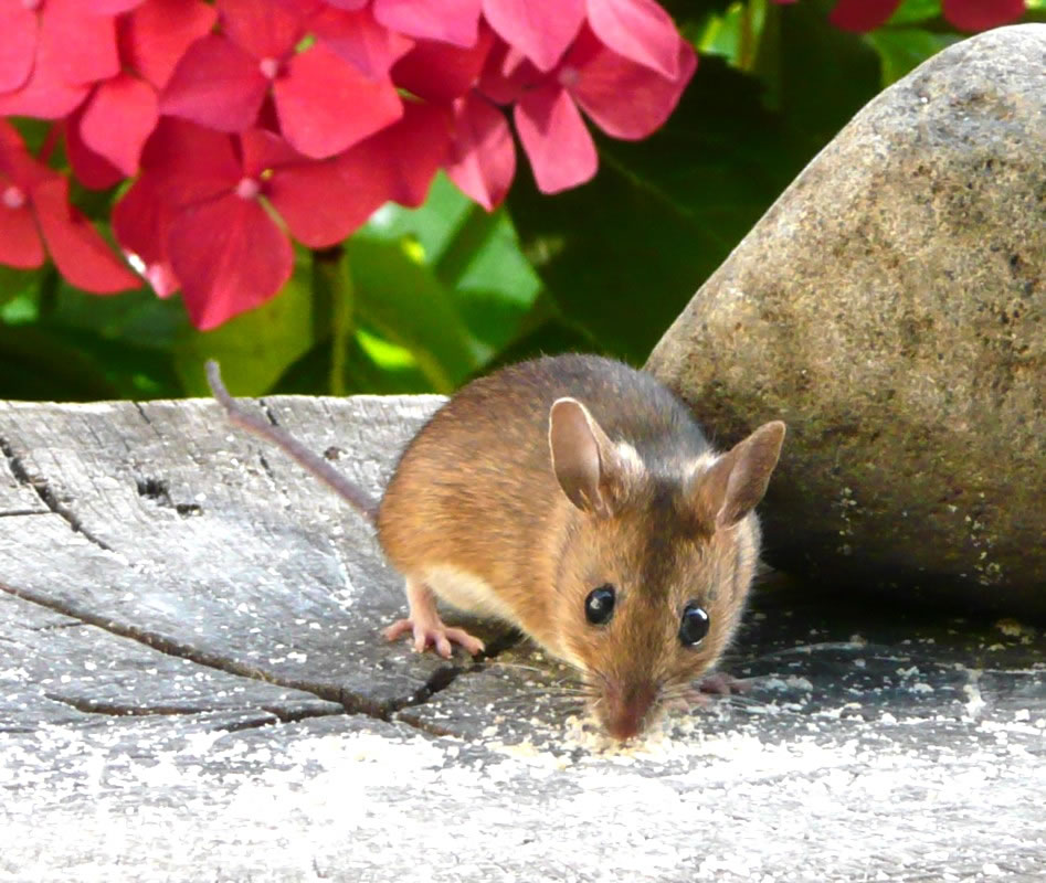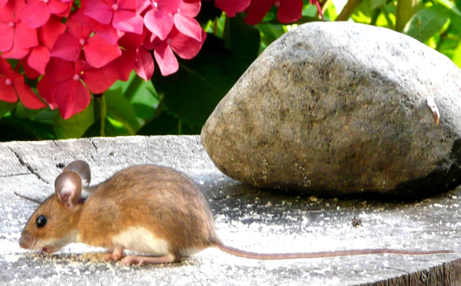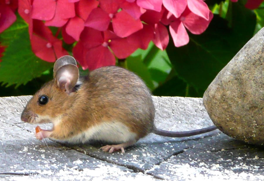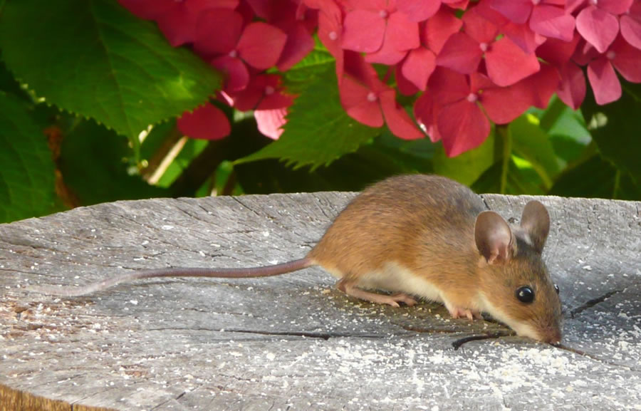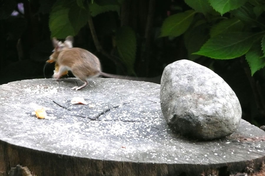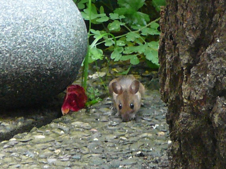 Een Stück Fisch na dat anner nehm se in ehr Vörpoten un freet dat up. De Lünken keken noch mal wedder up den Disch. Aver de Muus weer ehr nich geheuer, se söchen dat Wiede. Wi seten noch ümmer musenstill. Ik harr al en stiefen Nacken kregen. De Muus hett aver nich blots freten. Mit en Stück Fisch sprung se in enen Satz vun den Disch hindaal. Wi harrn al Bang üm se. Se bröch en Stück Fisch na dat anner weg, weer aver ümmer gau wedder dor. Wiss harr se lütte Kinner to versorgen. Na'n lütten Stoot meen mien Mann: "Is dat nich de Muus, de uns verleden Johr ok al besöcht hett?" "Ja, du hest Recht," anter ik, "dat is de Geelhalsmuus!" Dormals hebbt wi se aver blots tweemal sehn. Uns niege Naversch harr ehr'n Komposthupen ümgraavt. Dorbi weer se up en Muusnest stött. De Modder söch achterna ganz upreegt na ehr Kinner. Dorbi kunn ik de Muus dat eerstmal goot knipsen.