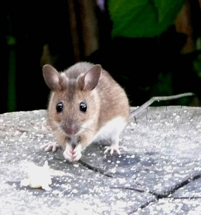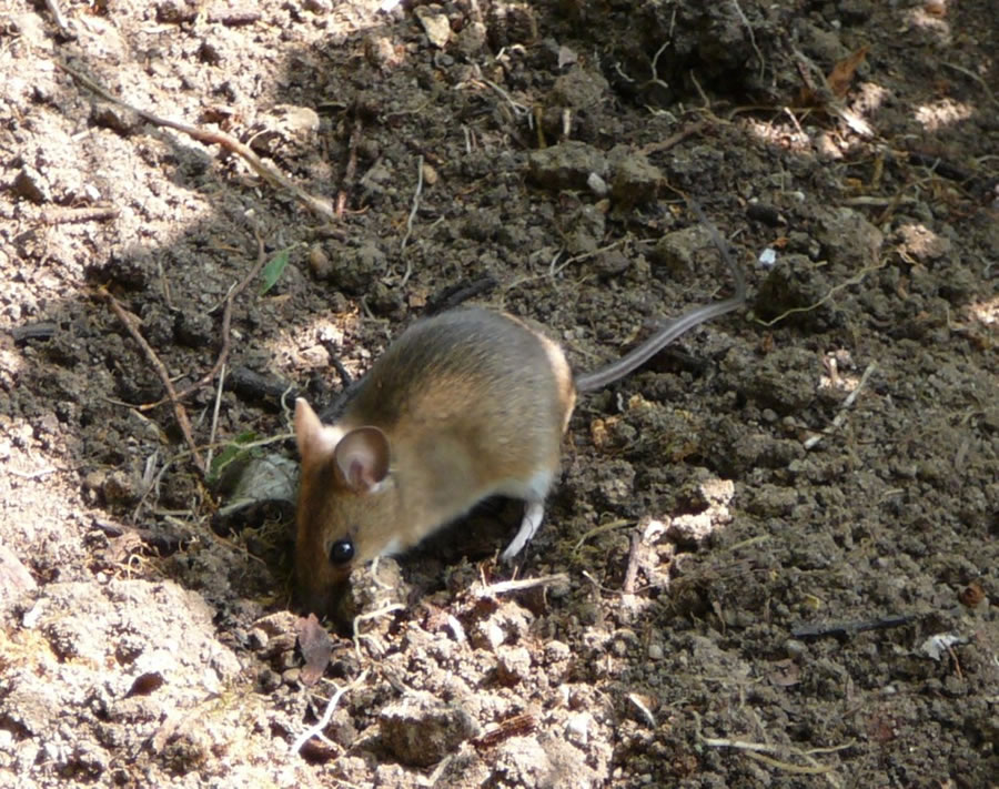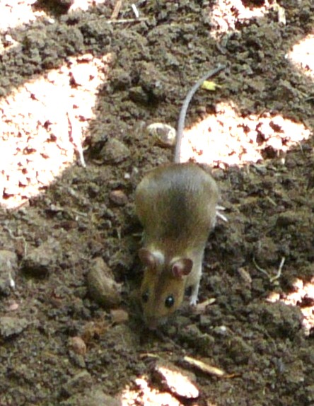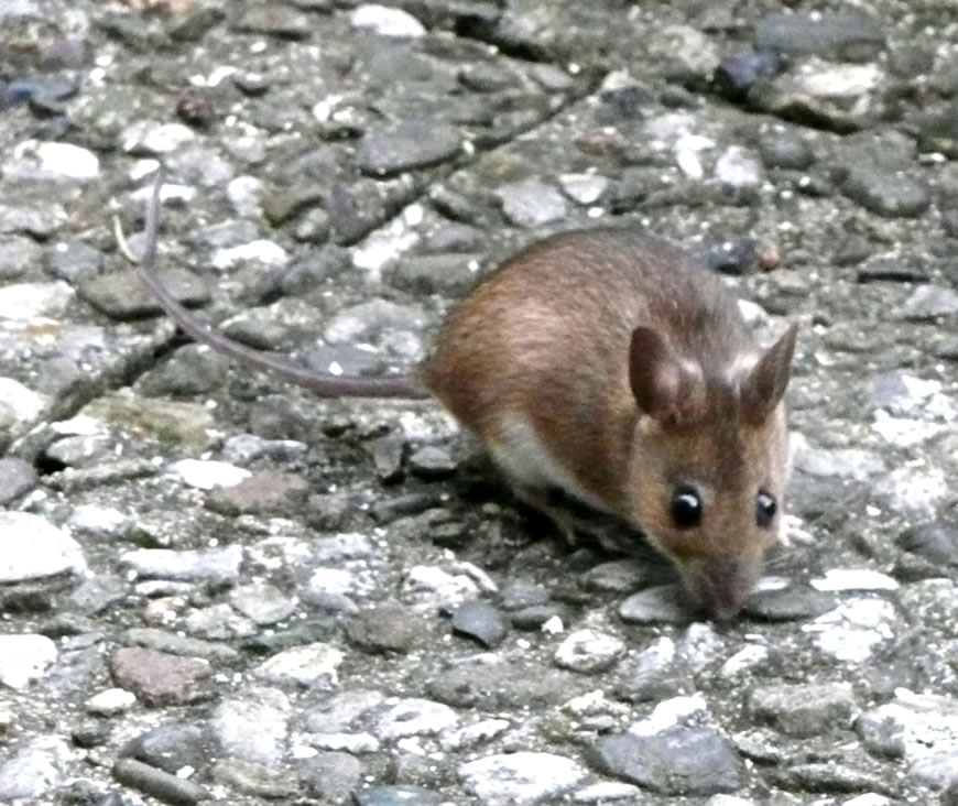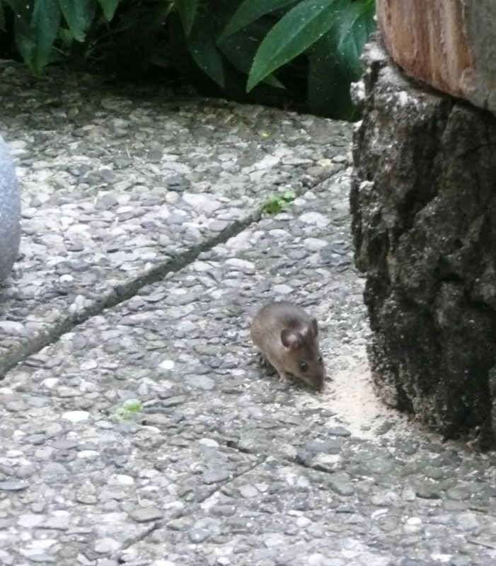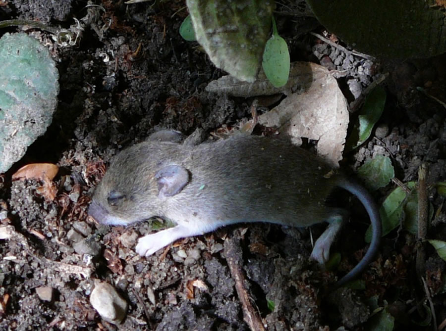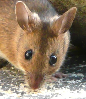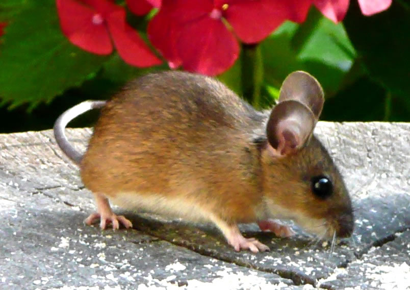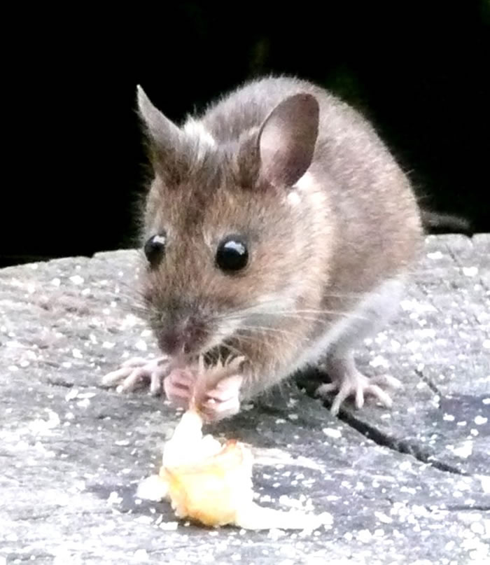 Een Stück Fisch na dat anner nehm se in ehr Vörpoten un freet dat up. De Lünken keken noch mal wedder up den Disch. Aver de Muus weer ehr nich geheuer, se söchen dat Wiede. Wi seten noch ümmer musenstill. Ik harr al en stiefen Nacken kregen. De Muus hett aver nich blots freten. Mit en Stück Fisch sprung se in enen Satz vun den Disch hindaal. Wi harrn al Bang üm se. Se bröch en Stück Fisch na dat anner weg, weer aver ümmer gau wedder dor. Wiss harr se lütte Kinner to versorgen. Na'n lütten Stoot meen mien Mann: "Is dat nich de Muus, de uns verleden Johr ok al besöcht hett?" "Ja, du hest Recht," anter ik, "dat is de Geelhalsmuus!" Dormals hebbt wi se aver blots tweemal sehn. Uns niege Naversch harr ehr'n Komposthupen ümgraavt. Dorbi weer se up en Muusnest stött. De Modder söch achterna ganz upreegt na ehr Kinner. Dorbi kunn ik de Muus dat eerstmal goot knipsen.