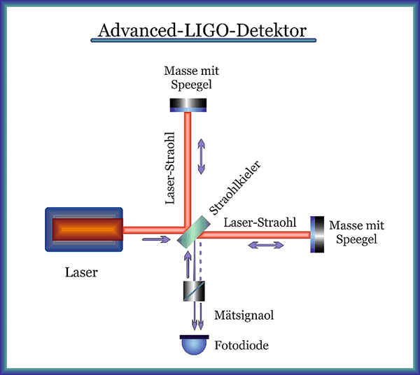 Hier süht man in eine vereinfachte Teiknung dat Warken van dei Laser-Straohlen in ein Laserinterferometer. In dei 1970er-Johre mök man dei eiersten Experimente mit Laserinterferometer. Disse Apparäöte häbbet twei Reuhers, dei in einen 90°-Winkel taueinanner ligget. Dordör löpp för sick ein Laser-Straohl un van dei Speegels an'n End van dei beiden Reuhers werd dei trüggespeegelt. Dei Idee tau disse Mät-Methode is, dat eine dörloopen G-Welle einen Arm van dat Interferometer in dei Längte trecket un den annern Arm tausaome stuuket. So möß dei duuren Tied, wekke dei Laser-Straohlen för den einkeln Weg bruuket, länger off körter wern. Draopet sick dei beiden Straohlen wedder, schwinget ehre Lechtwellen nich mehr in den süftigen Takt un gäwet so ein besünneret Signaol. Jüst dat will man mäten tau'n Faoten van dei G-Wellen. Hier kann man dat akustischk anpasste Signaol hörn: hier Bruce Allen säg: "Dat Signaol köm eiers bi eine leege Frequenz van 35 Hertz an, steeg denn mit dei Frequenz un harr nao 0,2 Sekunnen siene üppste Amplitude bi 150 Hertz. Dornao wörd dei Amplitude wedder leeger, dei Frequenz steeg up 250 Hertz un dat Signaol verschwünd. Dat is ein'n klassischken Chirp, as wi dortau sägget. Un dat kann blots van twei ineinannerschmelten Schwarte Löcker kaomen, annerswat giff et nich dortau." |