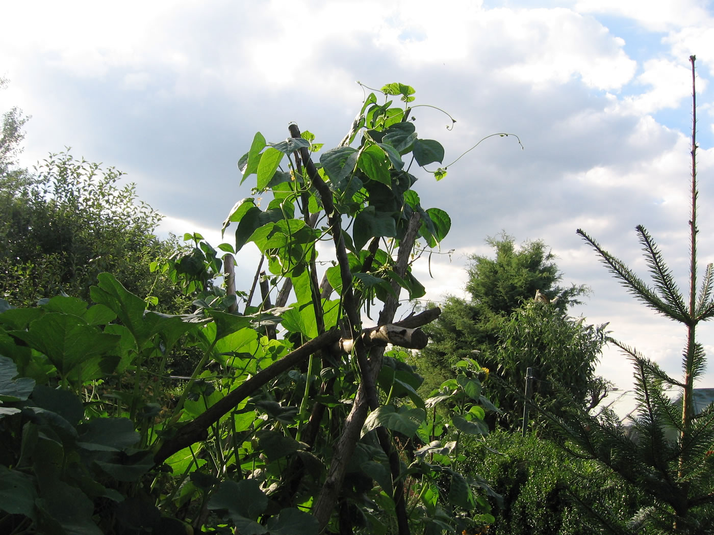 Körbs, Stangenbohnen un Zucchini ranken un wassen tosomen, krupen