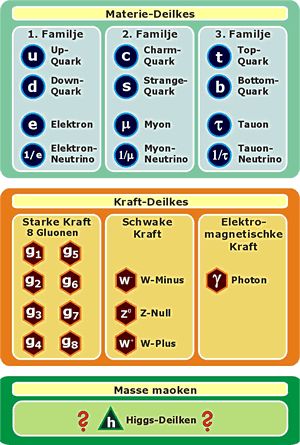 1964 menden dei britischke Physiker Peter Higgs un annere Mitwarkers, et möß dat Higgs-Boson gäben. Siet disse Tied söch dei weltwiet warken Deilkenphysik-Sellschkup iewrig ein Deilken, dat dat Vörkaomen van Masse in use Universum verkloaren schall. Naodem Experimente an Deilkendrievers in Europa un dei USA (LEP un Teravon) verstäken Henwiese för dei Existenz van dat Higgs-Deilken bröchden, ist dei Higgs-Jagd eine wichtige Upgaobe in dei moderne Deilkenphysik. Man worümme gühnt väle Deilkenphysikers nao dit neie Deilken? Wat kann man mit den Higgs-Mechaonismus verkloaren? Un wie kann man an den Large Hadron-Collider LHC nao langduurn Joahre, in dei dat Seuken vergäbens was, nu doch wat finnen? Dat Deilkendubbeln dör Supersymmetrie Dat wisse Wäten äöver dei Deilkenwelt is in dat so neumte Standard-Modell unnerbröcht. Dornao giff et einsiets Materiedeikes as Elektronen un Quarks, ut dei Atomkarns, Atome, Moleküle un uk wi Mensken bestaoht. Wiederhen warket Kräfte, worbie dei Deilkes Kraftdeilkes uttuschket. Tau jede Kraft giff et dorbie eigene Kraftdeilkes. Dei meisten Physikers glövet wieso an dei Existenz van Higgs-Deilkes, dei bi dat Herstellen van Masse ehre Fingers in't Spill hebbet. Aover disse Deilkes wörden bit nuhen noch nich funnen. Afännert nao: © Dirk Rathje/Sand und Schiefer, Hamburg Dat Beobachten wiest, dat bolde aale bekannten Elementoardeilkes eine laohme Masse hebbet. För dat Beschriewen van dei Elementoardeilkes un dei dortüschken warken Kräfte wiest sik aover, dat dei Beachtung van ehre Masse in dei Bewägungsformeln ein grootet Problem dorstellen deit: Dei Eigenschkup Masse stört dat Symmetrieprinzip (dat so neumte Iekprinzip), ut dat sik jüst disse Bewägungsformeln herleiten laotet. Dit Symmetrieprinzip warket so wunnerboar, dat aal dat Mäten van dei Kräfte tüschken Elementoardeilkes dormit tau verkloaren sünd et fallt somit schwoar, dissen so gaut loopen Grundplaon tau verlaoten. Un süß, we'm dat uk daun wull, bring dat Beachten van dei Masse in dei Bewägungsformeln för dei Deilkes bi hooge Energien ein sinnloset Wark. Dei Woahrschienlichkeit, dat twei massive Deilkes miteinanner wesselwarket, stigg dann äöver aale Grenzen weg, werd so mit dei Tied grötter as Eine so einen Befund kann et nich gäben. Utweg Higgs-Mechaonismus Up't Eierste lett dei Reddungsplaon för dat Iekprinzip wunnerlik: Et werd annaohmen, dat dei Elementoardeilkes dei Eigenschkup Masse goarnich hebbet. Up "Vaogel Strauß"-Oart laotet wie dei Masse einfach wäge: Dat Iekprinzip is reddet un aale Kräfte tüschken dei Deilkes werd pass un aohne Wedderspräken beschräben uk bi hooge Energien. Nu mäötet wi blots noch verkloaren, worümme use Mäten ergäven deit, dat sik dei meisten Deiles so verhollt, as harrn dei Masse, wo wi doch denket, dei sünd aohne Masse. An disse Stäe kiekt wi maol nao eine annere Definitschion för dei Eigenschkup "Masse": Wiels sik blots Deilkes aohne Masse in't Vakuum mit Lechttempo bewäget, kunn man Deilkes mit Masse as ein Deilken anseihn, dat sik in't Vakuum langsaomer as mit Lechttempo bewäget. Dei Trick ligg in dei Vörgaobe "in't Vakuum": Dei Grundannaohme van den Higgs-Mechaonismus is, dat dat, wat wi as "losen Ruum", nämlik as Vakuum belävet, goarnich los is. Dei heele "lose Ruum", so werd vörgäben, is vull mit ein Feld, dat Higgs-Feld. Aale Deilkes, dei dit Feld market, ännert ehr freiet Bewägen, so dat sik dei Deilkes nu nich mehr mit Lechttempo, sünnern langsaomer bewäget. Deilkes, dei dat Higgs-Feld market, verhollt sik so, as harrn sei dei Eigenschkup "Masse", uk wenn sei ansik (d. h. in einen würklich losen Ruum) aohne Masse sünd. In Waoter werd dat Gewicht van einen Körper minner, wiel hei eine nao baoben warken Updrievkraft market. Dat Mäten van Gewicht hang so af van dei Ümgäbung. Ähnlik hang bi'n Higgs-Mechaonismus dei mäten Deilkenmasse van ehre Ümgäbung (dat Higgs-Feld) af. Afännert nao: © Welt der Physik/Dirk Rathje (cc 2.0 by-nc-nd)
