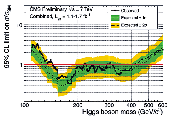 Dei Driever LHC an'n CERN is in dei aktuellen Mätaktschion siet Ende 2009 in Bedriev un lävert sietdem orrig gaut Daoten. Disse werd van dei beiden Experimente ATLAS un CMS upnahmen un unnersöcht. An'n LHC werd Protonen mit eine Energie ümmer van 3,5 TeV tausaomeschaoten. Wägen disse högeren Energien kunn man hier uk möglike Higgs-Bosonen mit eine düütlik högere Masse finnen. Dei experimentellen Resultaote, dei sik wedder ut eine Kombinatschion van väle einkele Anaolysen tausaomesettet, sünd för ATLAS in Bild 3 un för CMS in Bild 4 dorstellt. Beide Experimente käönt dormit dei Existenz van ein as in dat Standardmodell vörutseggte Higgs-Boson in'n Masseraohmen tüschken rund 140 un 450 GeV utschluten. Un wo geiht et wieder? Dei möglike Massseraohmen för ein Standardmodell-Higgs-Boson kunn so van dei Experimente an'n Tevatron un an'n LHC mit dei vörliggen Daoten däget inschränket wern. In dei taukaomen Maonde werd sik dei Anaolysen jüst up einen Masseraohmen, dei unner 140 GeV ligg, konzentreern, den man bit nu hen noch nich utschluten kunn. Dei Signaoturen van ein Higgs-Boson sünd hier düütlik komplexer, un mehr Daoten sünd nödig, dat'm siene Existenz naowiesen of utschluten kann.