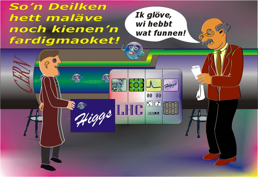 An dat Europäischke Forschkungszentrum CERN hebbet dei Physikers ein Deilken mit eine Masse tüschken 125 bit 126 Giga-Elektronenvolt (GeV) funnen. Et is mutz 134-maol so schwoor as ein Proton. Wohrschienlik is et dat lange söchte Higgs-Deilken. Aover man kann noch nich faste anseggen, wo dat mit dit Deilken nau is.