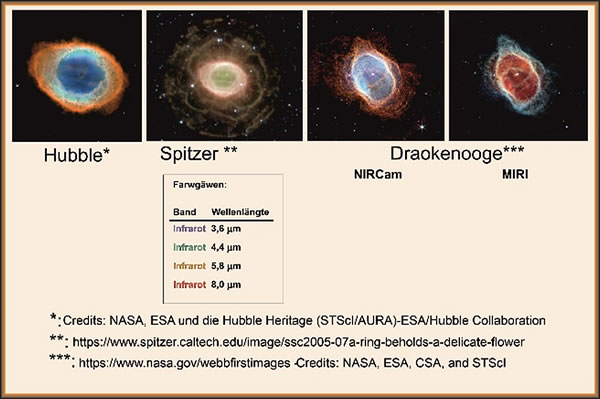 Dat blawe Gas in dei Näwel-Midde is mehr ein Fautball, den man dor süht un dei sick dör dat roe Materiaol recket. Dei Binnenkante van den Kring wiest einen Upbau ut düstere, huckeligge Knüppens ut dichtet Gas, dei dei Sternenwinde noch nich wegpußen kunnen. Disse Knüppens mit ehre Steerde laotet as Speeken in ein Rad. Dit Bild van M57 wörd so infarwet, dat man den chemischken Upbau van den Näwel bäter seihn kann. Dei düsterblawe Farwe in dei Midde staiht för Helium, dei lechtblawe Farwe in den Binnenkring is dat Lüchten van Waoterstoff un Suurstoff. Dei rot schienen Farwe in den Buutenkring kummp van Stickstoff un Schwäwel. Hier nu dei Biller van twei Kameras an James Webb: