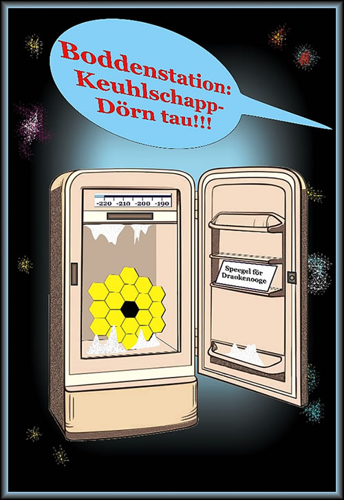 Bi den Bedriew van Draokenooge mäötet dei Speegels alltied orig kold wän. Wenn man dei eiersten Sterne un Melkstraotens (Galaxien) in dat freuhe Universum seihn will, mäötet dei Astronomen ehr affstraohltet Infrarot-Lecht (IR~) faoten. Dortau mutt man ein Teleskop-Instrument-System insetten, dat för dit IR-Lecht optimeiert is. Warme Objekte gäwt Infrarotlecht off Warmte aff. Wenn dei Speegel van Draokenoge deisüftige Temperatur har as dei van dat Hubble-Weltruum-Teleskop, güng dat schwacke Infrarotlecht van wiet wegliggen Melkstraotens in dei Infrarotstraohlung van dei Speegels unner. So mutt Draokenoge orig kold ("kryogen") wän. Dei Speegel-Temperatur ligg bi dei -220°C. Dei heile Speegelanlaoge mutt dorbi dei recht deipen Temperaturen uthollen un ehre Form stabil hollen. Dormit Draokenoge staodig so kold bliff, bring man et in den Weltruum, wiet weg van dei Ern. Sünnenblenden wohrt mit ehren Schadden dei Speegels un dei Instrumente vör dei Sünnenhitte un scheermt dei aff van dat "warme" Ruumfohrtüg.