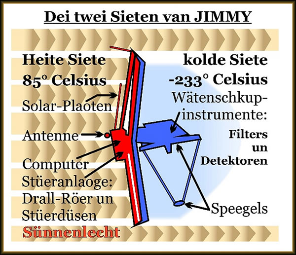 Worümme fief Laogen? Wotau hätt dei Sünnenscherm fief Laogen un nich blots eine einkelne dicke? Jede naokaomen Laoge van den Sünnenscherm is köller as dei vörige. Dei Warmte straohlt tüschken dei Laogen rut, un dat Vakuum tüschken dei Laogen isoleiert gaut. Was dei Sünnenscherm blots groot un dick, güng dei Warmte dor bäter dör, as bi fief Laogen, dei dör ein Vakuum trennt sünd. Dei Sünnenscherm bestaiht ut ein lichtet Materiaol mit besünnere thermischke Eigenschkupen. Man neumt dat Wark Kapton, dat uck noch extrao beschichtet is.