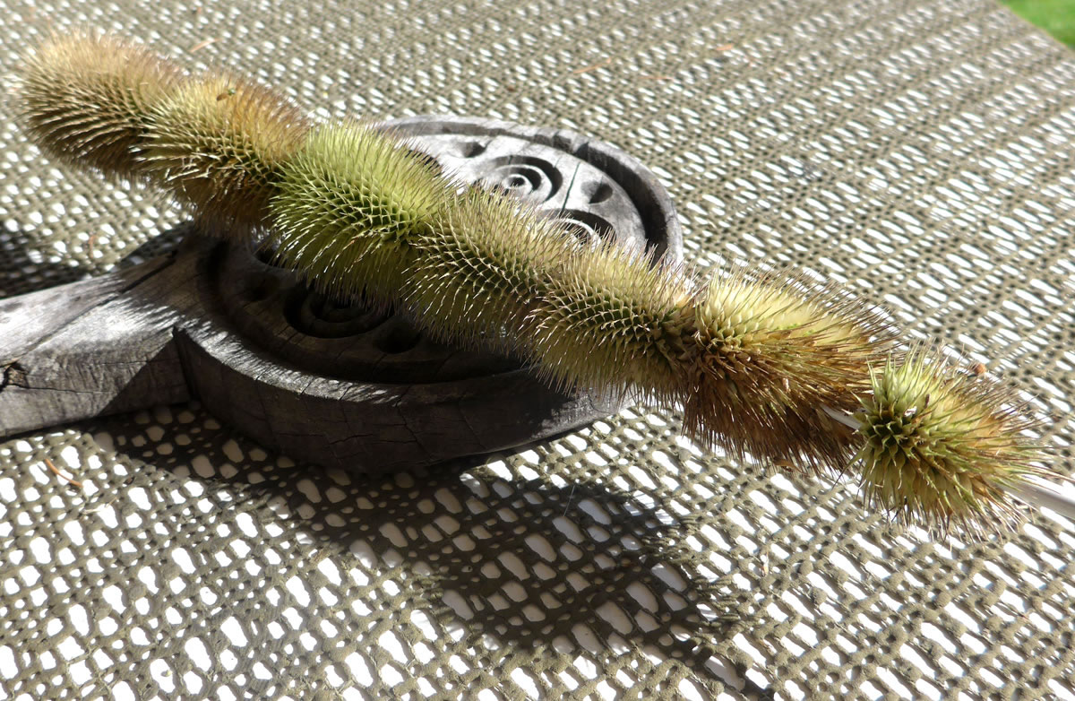 de drögen Köpp vun de wilde Karde up en Stricknadel to steken